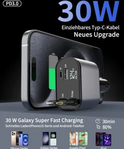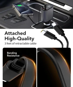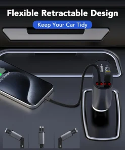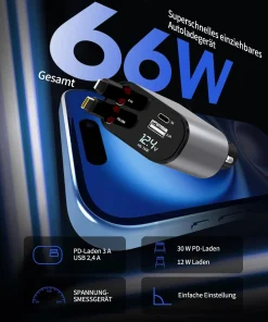 Das einziehbare Kabel bietet Typ-C-Ladegeschwindigkeiten von bis zu 66 W und pd30 W, einschließlich USB- und Typ-C-Anschlüssen, und der Zigarettenanzünderadapter wird für USB-Autoladegeräte verwendet. Mehrere Ports bieten PD30W und QC3.0.