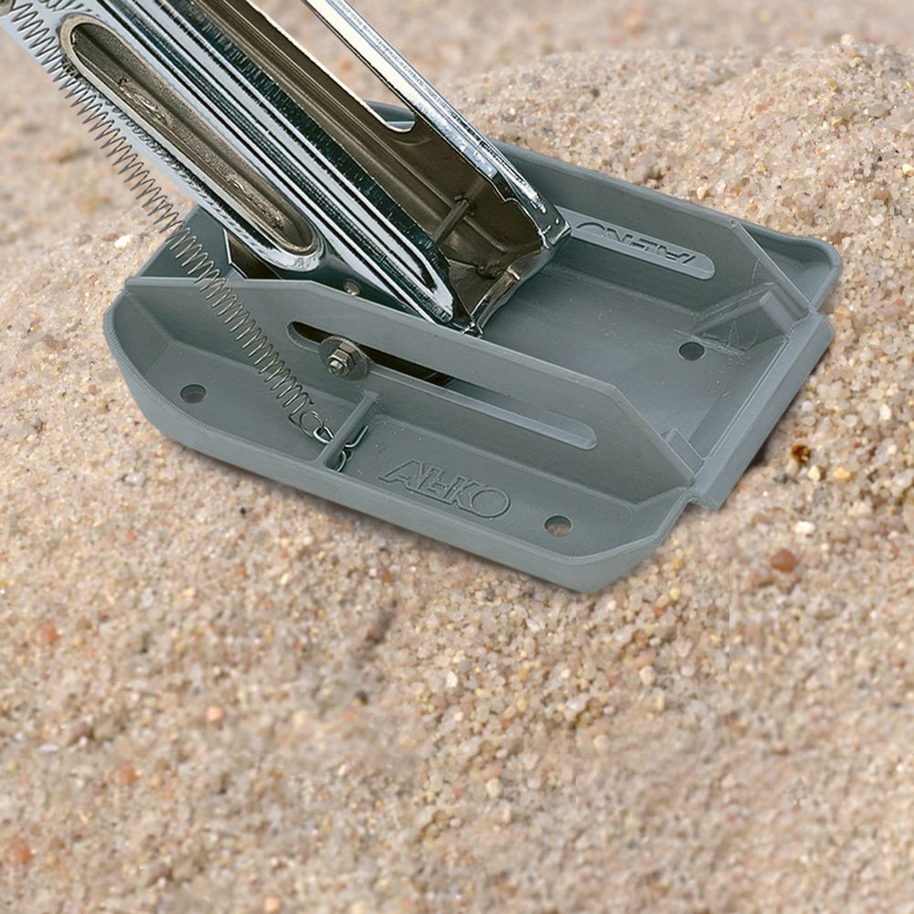 Mit der großen Standfläche (200 x 180 mm) und den Querrippen verhindert der AL-KO big foot™ ein Wegrutschen oder Einsinken der Stützen und sorgt für absolut sicheren Stand des Wohnwagens. Der Abstützfuß besitzt eine Tragfähigkeit von statisch maximal 1250 kg.