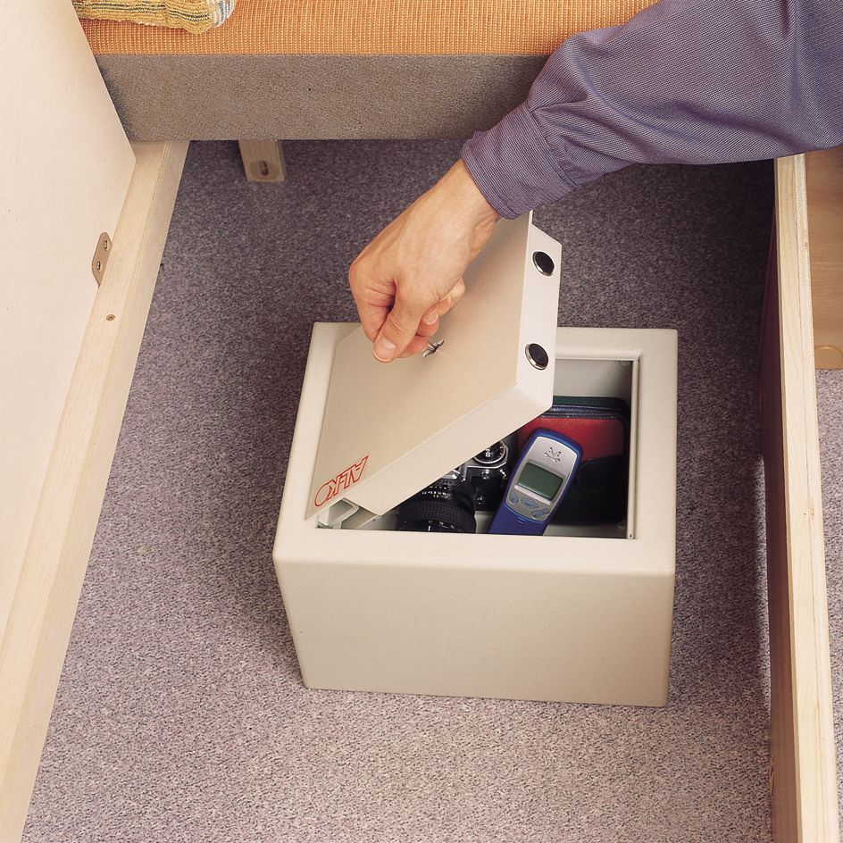 Hinter soliden Stahlwänden ist Ihr Hab und Gut sicher vor fremdem Zugriff. Nur der Doppelbart-Sicherheitsschlüssel öffnet die stabilen Rundbolzen der Tresortür. Unabhängig von Strom und Batterie ruht der Panzerschrank im Caravan, fest verankert durch eine Montageplatte auf dem Fahrzeugboden.