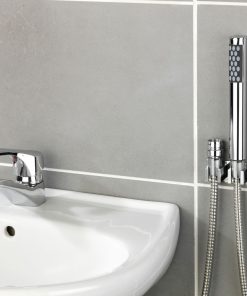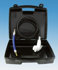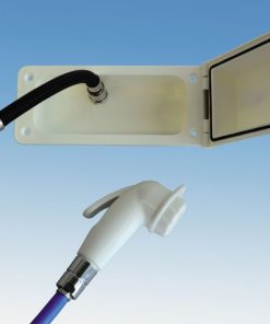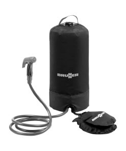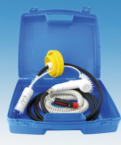 Reisedusche für Wasserkanister. Mit leistungsstarker Tauchpumpe (8 Liter/Minute), Brauseschlauch mit Brausekopf, Saughalterung für Brausekopf und Anschlusskabel mit Zigarettenanzünder-Stecker.