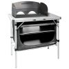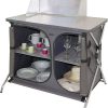 Ein vormontiertes Rahmengestänge aus Aluminium, auf das ein hochwertiger Bezug aus widerstandsfähigem Polyester aufgezogen wird, bildet das Gerüst für die in Anthrazit gehaltenen Schränke. Die abriebfesten, aus Ripstop Polyester gefertigten Gestängekanäle des Bezugs, in dem rückseitig eine Lüftungsgaze eingearbeitet ist, sorgen für schnellen Auf- und Abbau, die Ablageböden werden einfach eingelegt. Alle Drehteller-Füße sind höhenverstellbar und sorgen auch auf unebenem Untergrund für sicheren Stand. Den oberen Abschluss der stabilen Konstruktion bildet eine Ablageplatte. Eine praktische Trage- und Aufbewahrungstasche gehört zum Lieferumfang.