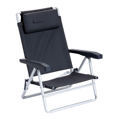 Zusammenklappbarer Strandstuhl mit verstell- und abnehmbarem Kopfpolster. Die Rückenlehne kann in 8 verschiedene Positionen verstellt werden. Gestell aus Aluminium.