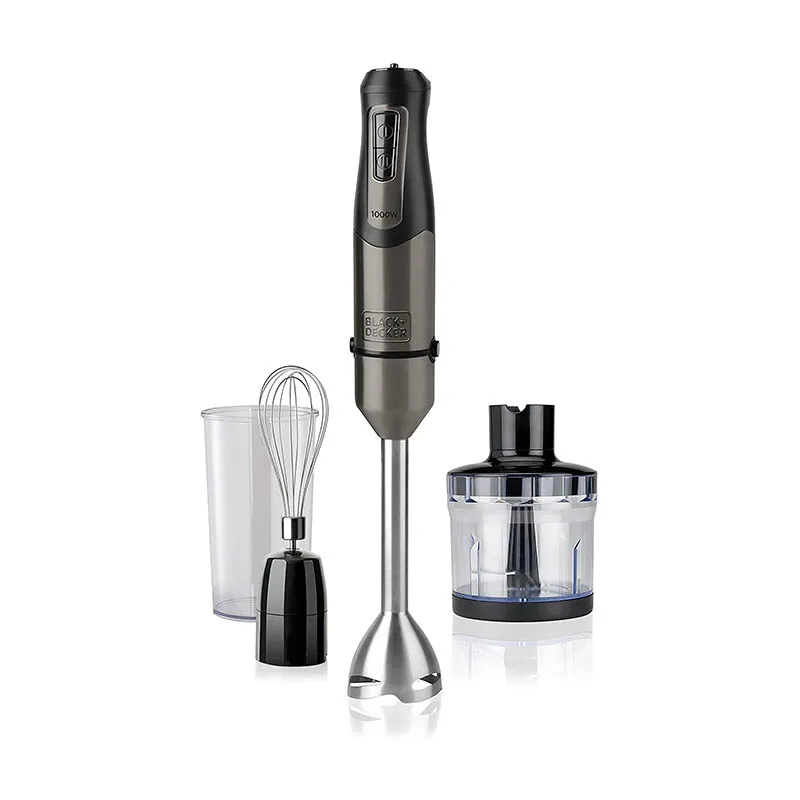 Der Black & Decker Stabmixer aus Edelstahl mit Zubehör ist mit einem Stab und 4 Edelstahlklingen gegen Fingerabdrücke ausgestattet, um die feinste Creme zuzubereiten.