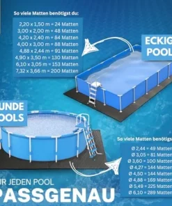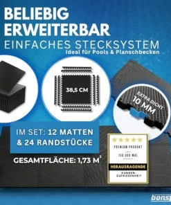 Unsere hochwertigen Pool Matten schützen Ihren Poolboden optimal vor Beschädigungen durch spitze Gegenstände wie z.B. Steinchen. Die Puzzle Matten lassen sich einfach und ohne Werkzeug verlegen und sind zudem langlebig und ungiftig.