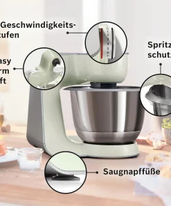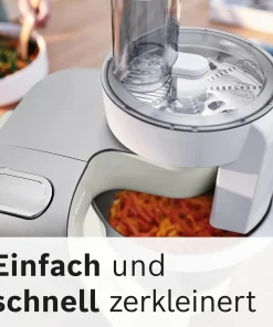 Die Teigwerkzeuge aus Edelstahl sorgen durch dreidimensionales Rühren für ein perfektes Mischen der Zutaten und sind spülmaschinengeeignet. Der Durchlaufschnitzler mit 3 Scheiben und der Mixbecher aus Tritan ergänzen die Küchenmaschine perfekt.