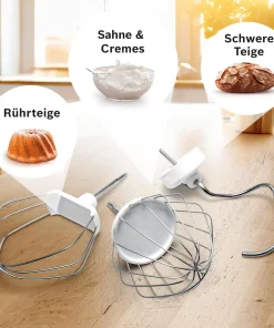Das inkludierte Patisserie-Set mit Knethaken mit Teigabweiser, Schlag- und Rührbesen ist ideal für feine Rührteige, schwere Hefeteige, Sahne oder Eischnee. Das Zubehör ist spülmaschinengeeignet und kann in der mitgelieferten Zubehörtasche verstaut werden.