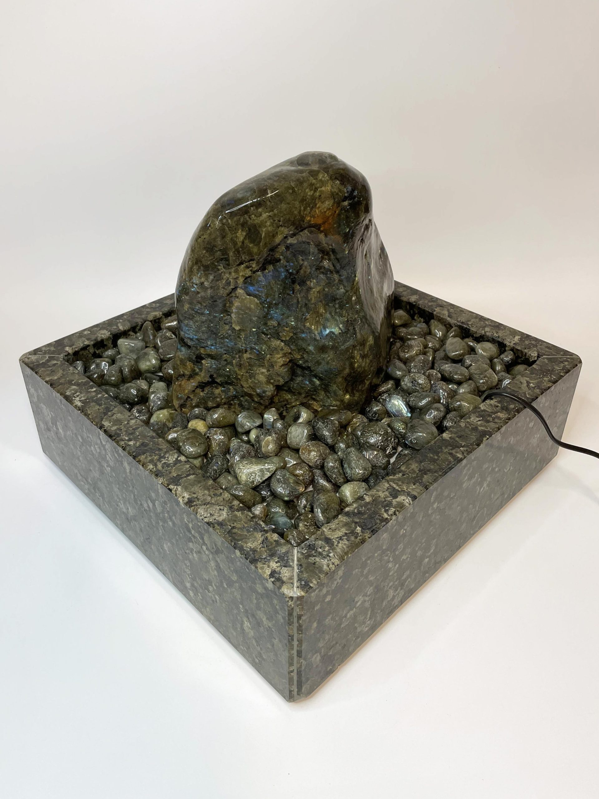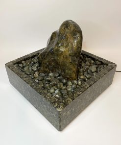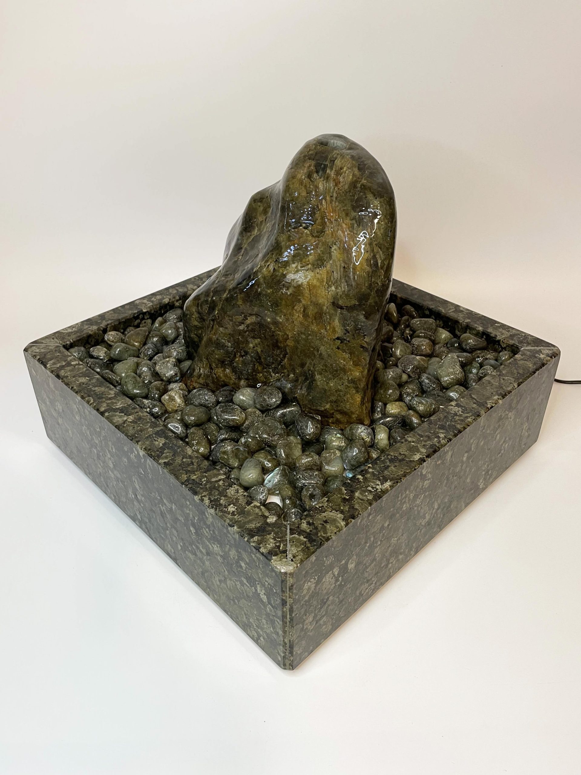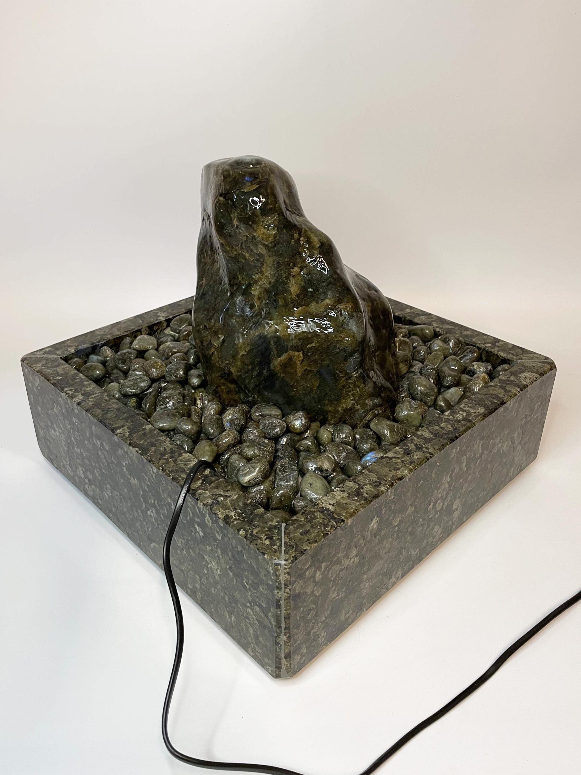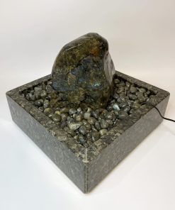 Der Brunnen „Dakar“ besteht aus mehreren sorgfältig abgestimmten Komponenten. Der Quellstein ruht auf einem passgenauen Basistisch aus Hartschaum, der mit edlen Trommelsteinen aus „Labradorit“ bedeckt ist. Die Pumpe, die das Wasser sanft über den Stein fließen lässt, verbirgt sich diskret unter der Platte und kann jederzeit über eine Eingriffsklappe erreicht werden.