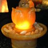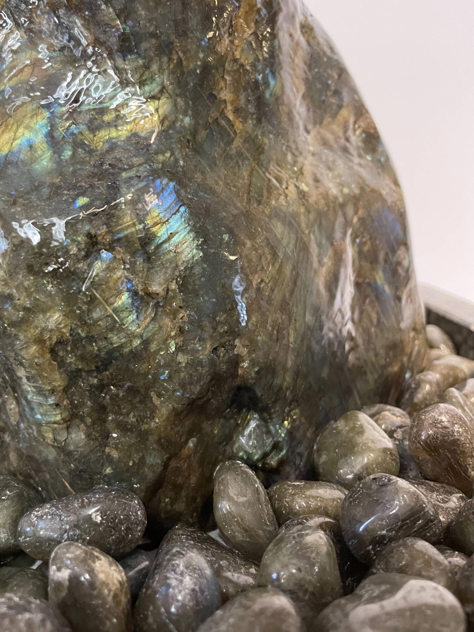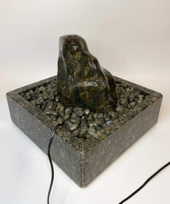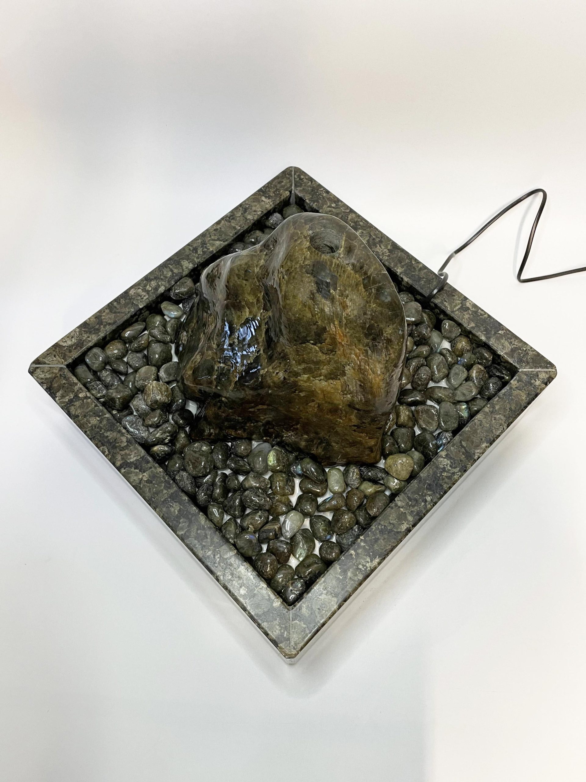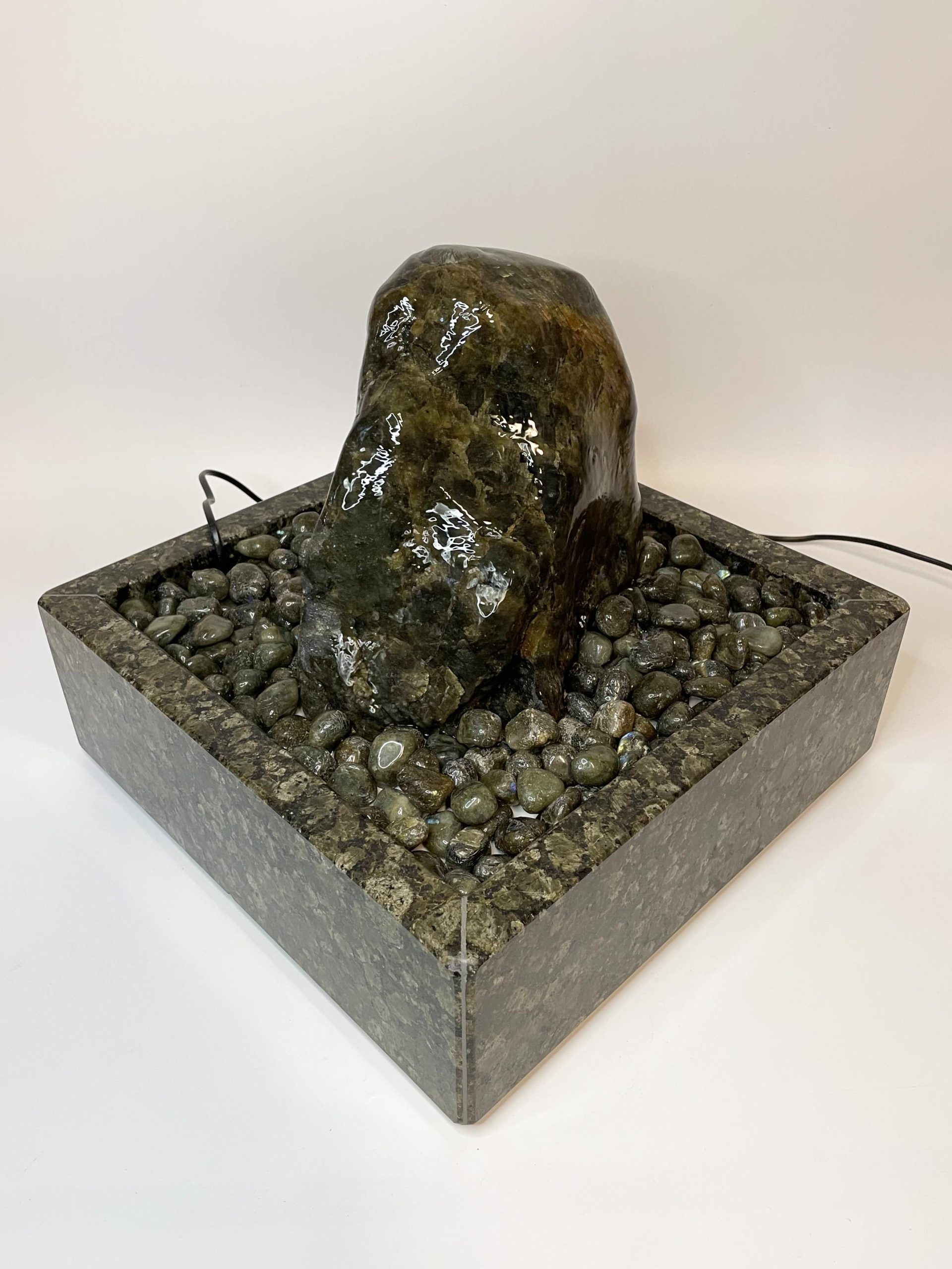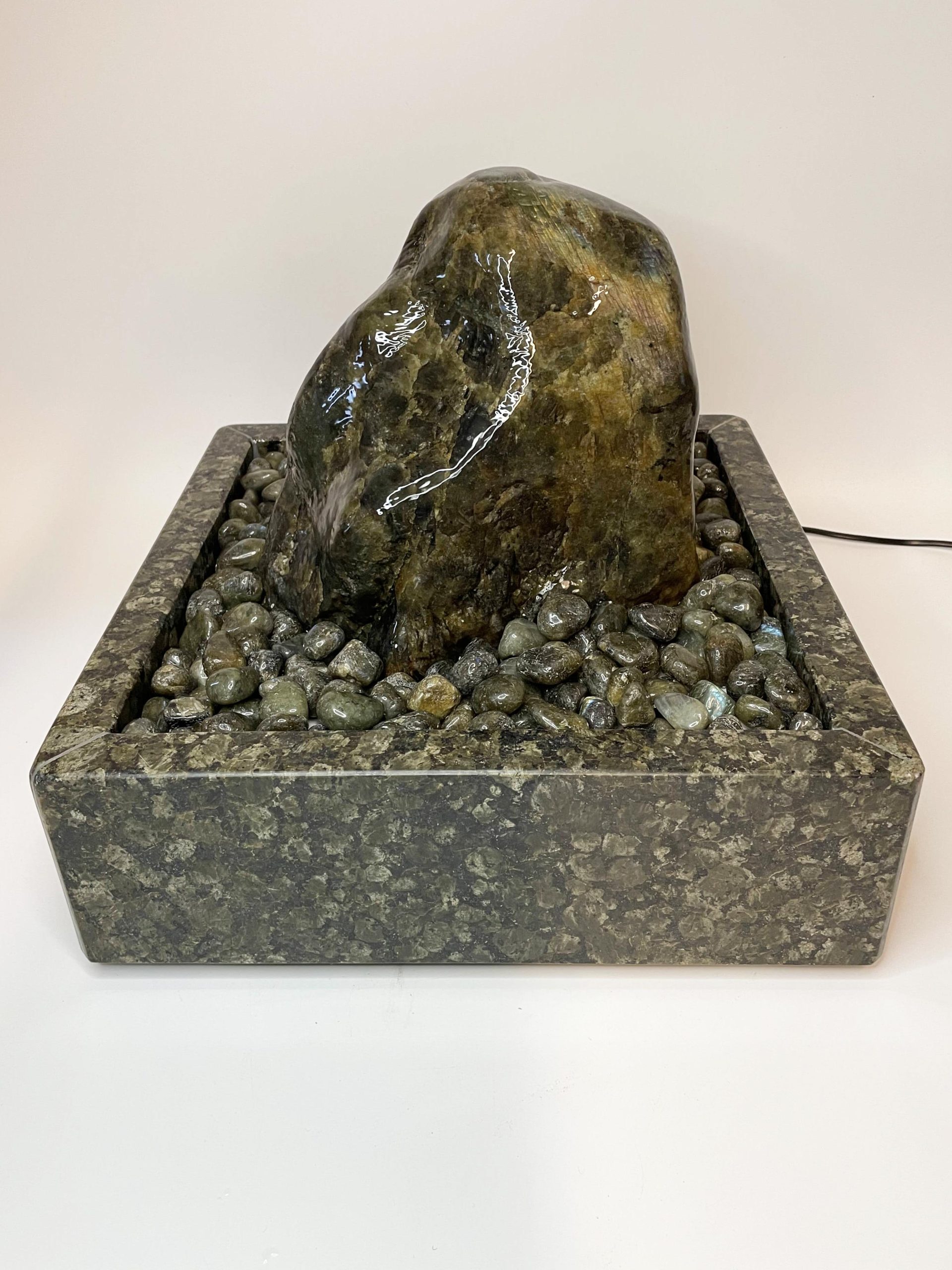 Der Brunnen „Dakar“ besteht aus mehreren sorgfältig abgestimmten Komponenten. Der Quellstein ruht auf einem passgenauen Basistisch aus Hartschaum, der mit edlen Trommelsteinen aus „Labradorit“ bedeckt ist. Die Pumpe, die das Wasser sanft über den Stein fließen lässt, verbirgt sich diskret unter der Platte und kann jederzeit über eine Eingriffsklappe erreicht werden.