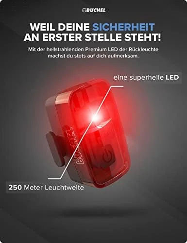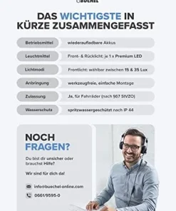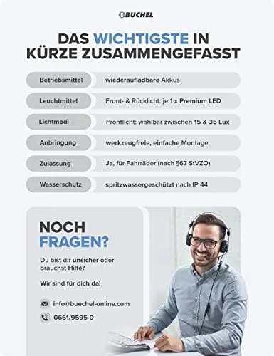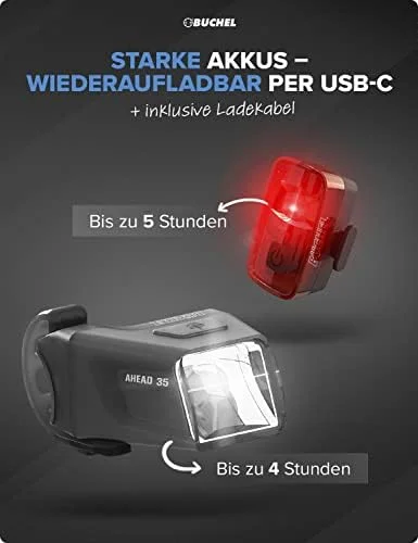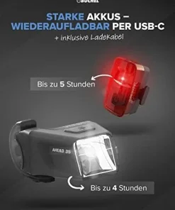🌧️ REGENFEST & LANGE LEUCHTDAUER: Spritzwassergeschützt nach IP44 mit einer Leuchtzeit von bis zu 4 Stunden (Front) und 3 Stunden (Rücklicht). Im Lieferumfang: 1 Front- & Rücklicht, Halterungen, Mikro-USB-Kabel.