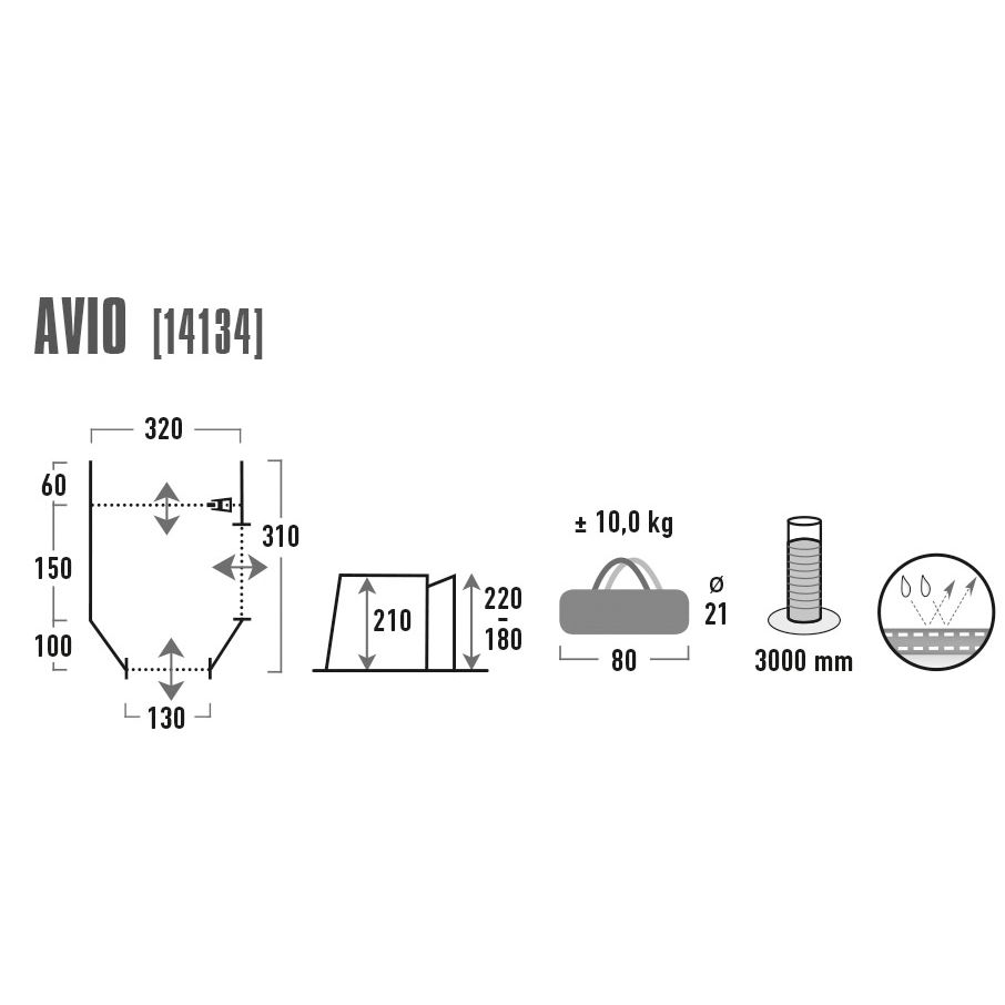 Lieferumfang: Zelt, Gestänge, Abspannmaterial, Packtasche.
