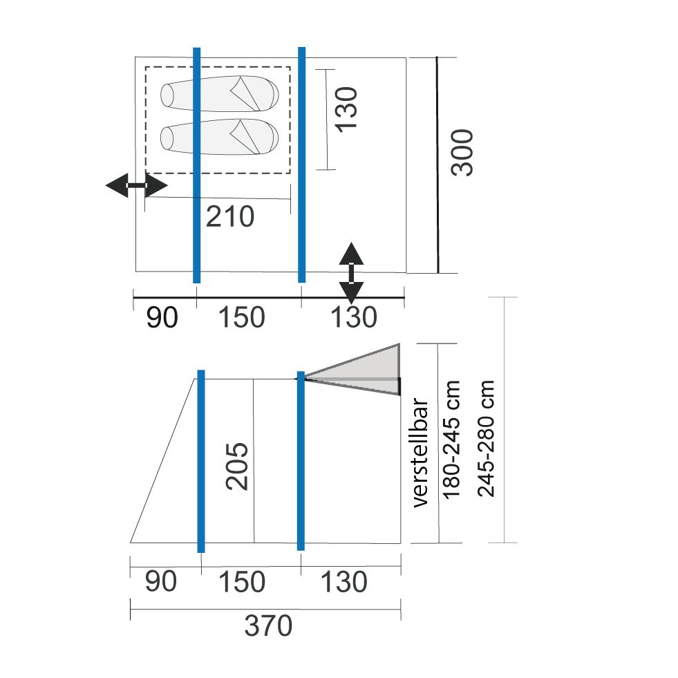 Material: besonders leichtes, schnelltrocknendes HydraDore SL 3000 Außenmaterial mit UV Ausrüstung. Bodenplane: 100 % Polyethylen.