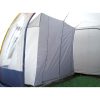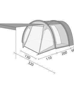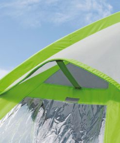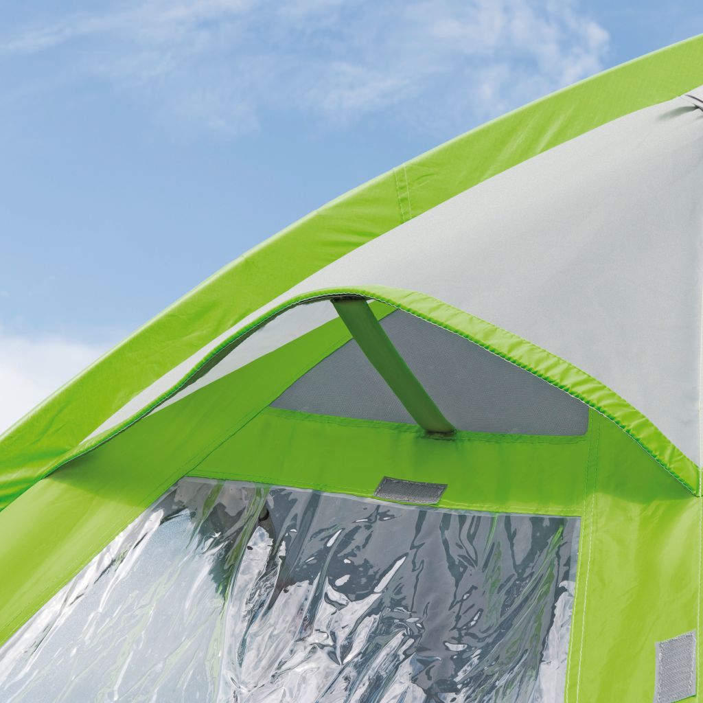 Seitenwände mit Fenstern inkl. Moskitonetze. Linke Seitenwand: Klappe mit Reißverschluss verschließbar. Rechte Seitenwand: Eingangstüre ausstellbar als Sonnendach (Aufstellstäbe nicht im Lieferumfang enthalten). Klappe mit Reißverschluss verschließbar.