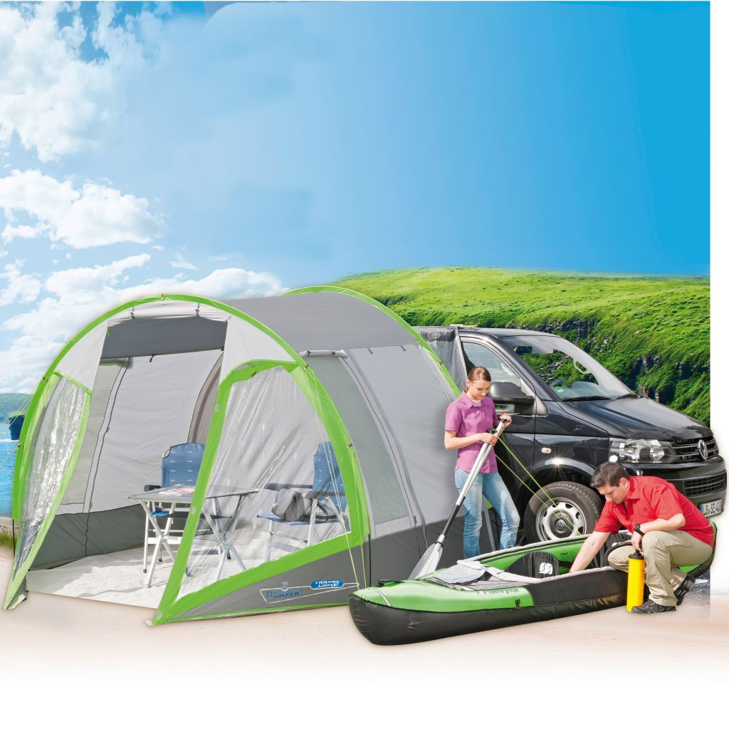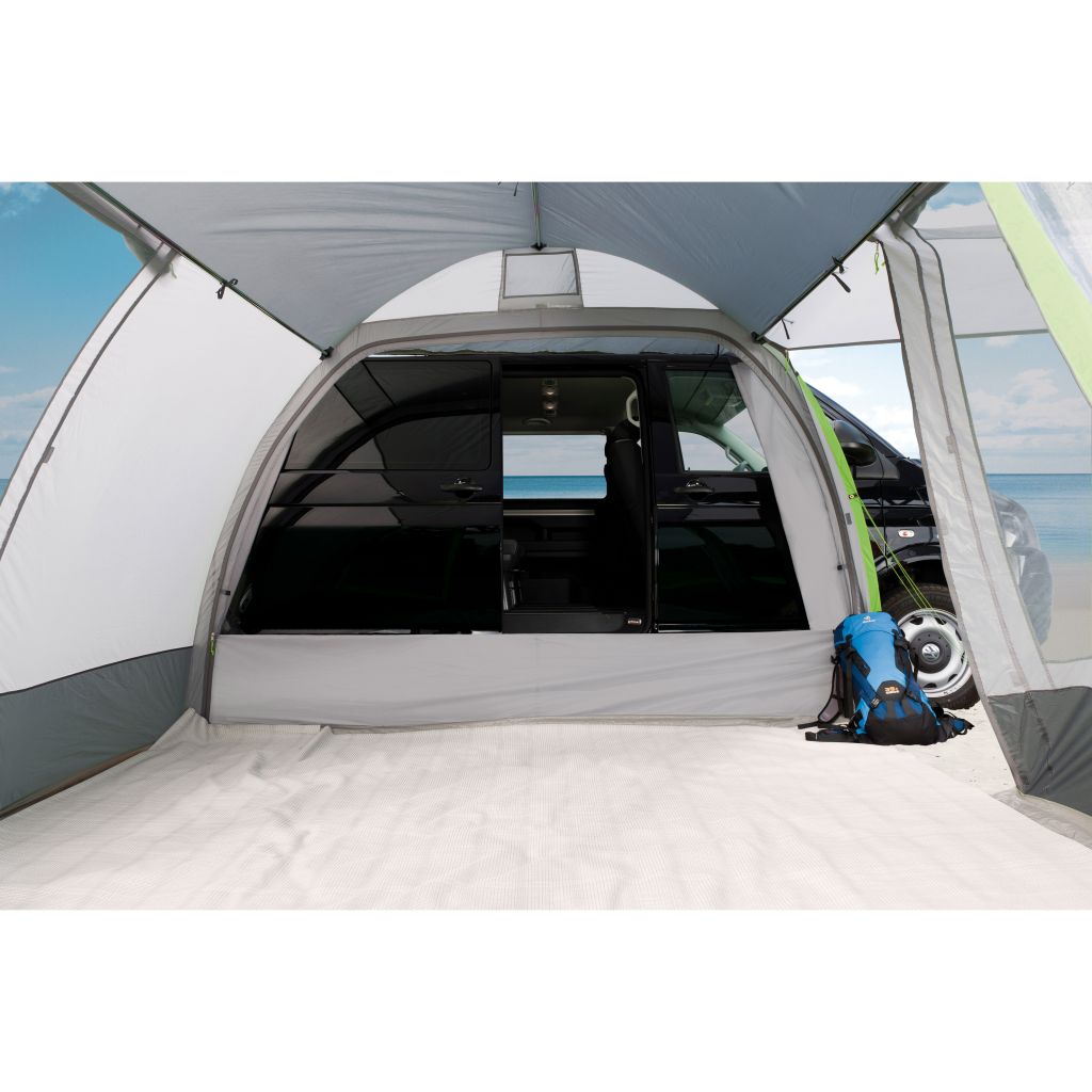 Aufbau in nur 10 Minuten. Das Design und die funktionalen Details machen dieses Busvorzelt zu einem wahren Multitalent. Freistehend; Rückwand mit Reißverschluss verschließbar. Befestigung mit Schleusenstab.