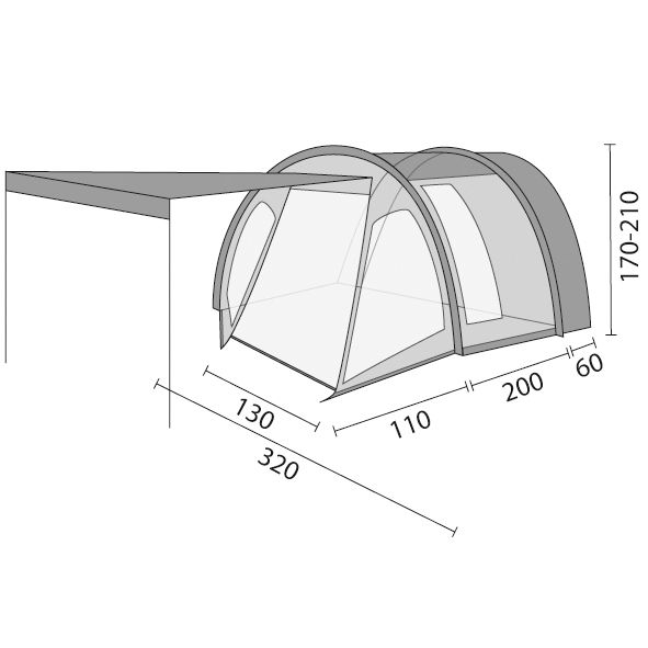 Lieferumfang: Zelt, ø 11 mm Fiberglas-Gestänge mit 3 zusätzlichen Dachstangen und Schleusenstab, Abspannmaterial, Packsack.
