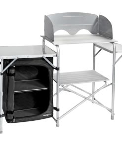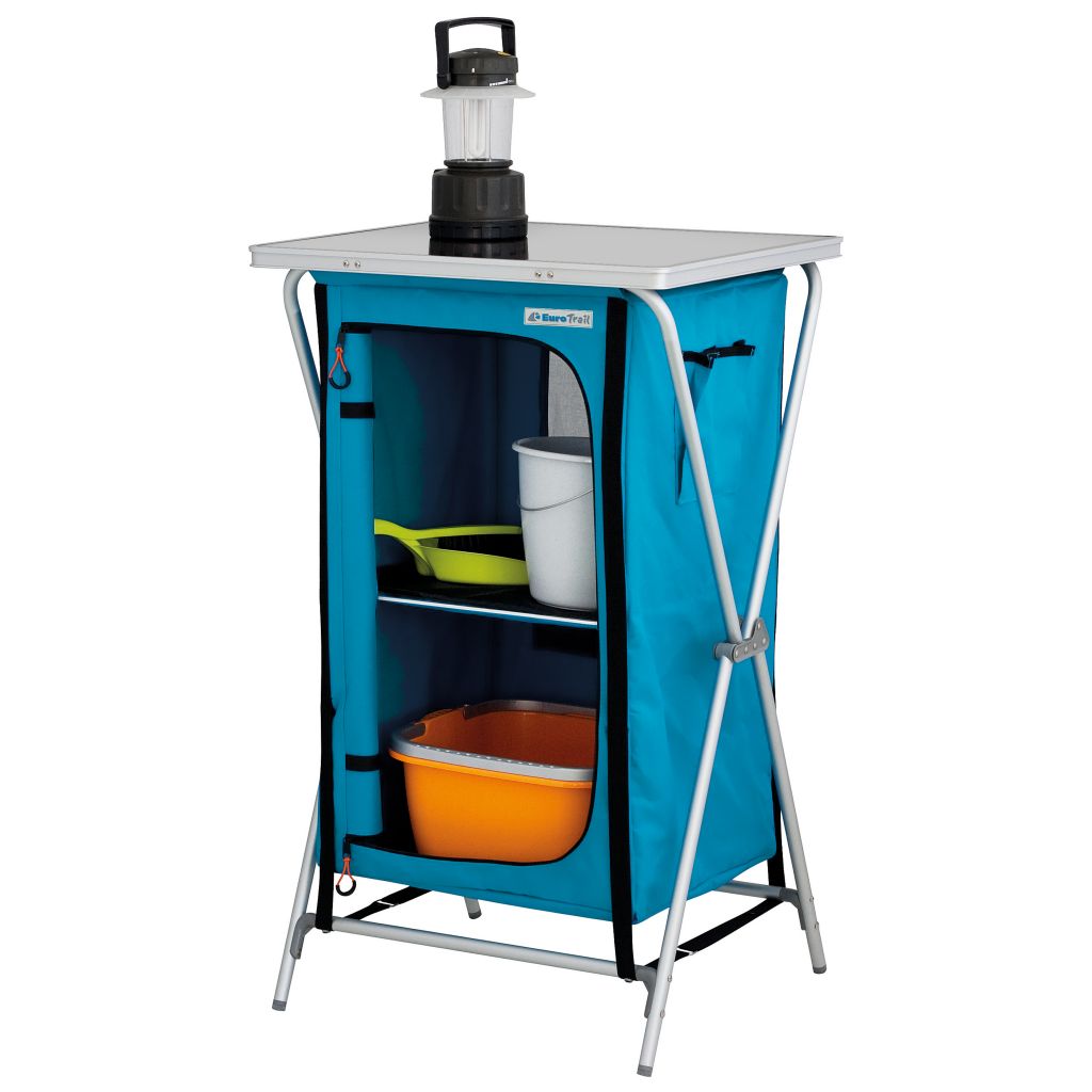 Mit ihrem Polyesterbezug in Azurblau bringen diese Faltschränke einen neuen frischen Farbakzent ins (Vor-)Zelt. Die Montage ist denkbar einfach, denn der Bezug ist mit dem außenliegenden Aluminiumgestänge verbunden – einfach auseinanderklappen und der Schrank steht praktisch schon. Es müssen nur noch die Tischplatte aufgeklipst und die Regalböden eingelegt werden – fertig! Die Ausstattung umfasst eine seitlich angebrachte Utensilientasche, die Rückseite ist mit atmungsaktiver Gaze versehen. In einer handlichen Tragetasche verpackt können die Schränke leicht transportiert und bei Nichtgebrauch verstaut werden. In kleinere Zelte passt der Schrank Rieux, der abgesehen von der Utensilientasche und einer dunkleren Platte dieselbe Ausstattung wie die anderen Schränke der Serie aufweist.