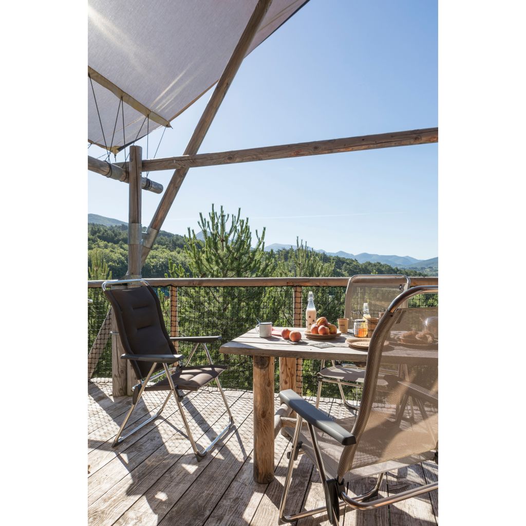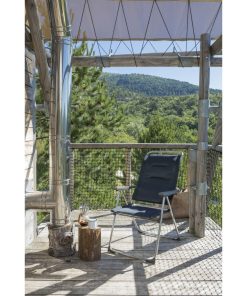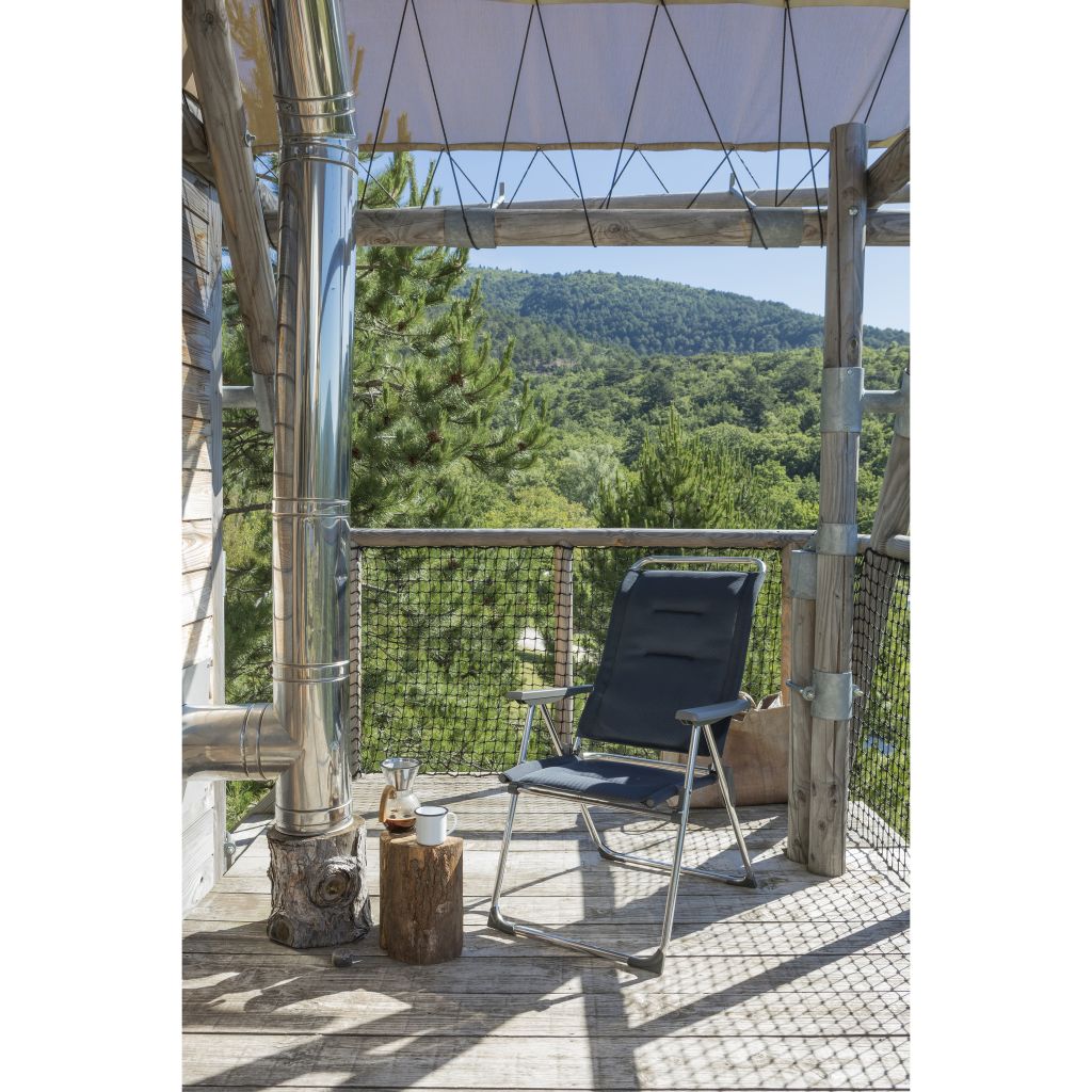 Klappstuhl mit hoher ergonomischer Rückenlehne mit Lendenlehne, Sitzbezug mit 3 Schichten, sehr atmungsfähig und schnelltrocknend, Struktur aus Aluminiumlegierung (ø 22 mm), 5-fach verstellbar mit den Armlehnen, ergonomisch geformte Armlehnen und Bodengleiter aus Harz.