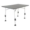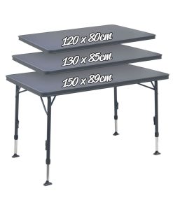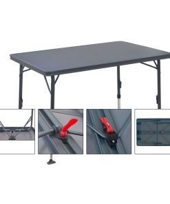 Leichter Camping-Klapptisch mit widerstandsfähiger Melamin-Tischplatte. Ausgestattet mit vier verstärkten regulierbaren Tischbeinen von 28 mm Durchmesser und seitlichen Verstrebungen, ist auf jedem Untergrund ein fester Stand gegeben. Das Fixiersystem verfügt über hochwiderstandsfähige Gleitschienen. Die Epoxybeschichtung der Aluminiumstruktur sorgt für eine noch höhere Robustheit und ist pflegeleicht.