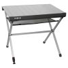 Die ultraleichte Tischplatte aus wetterfestem, mehrschichtigen Glasfasermaterial hat keine Kante und somit kann Wasser und Schmutz einfach ablaufen. Dank einer modifizierten Klapptechnik ist unter dem Tisch viel Beinfreiheit und alle 4 Tischbeine sind in Höhe und Neigungswinkel verstellbar – zum Ausgleich möglicher Unebenheiten.