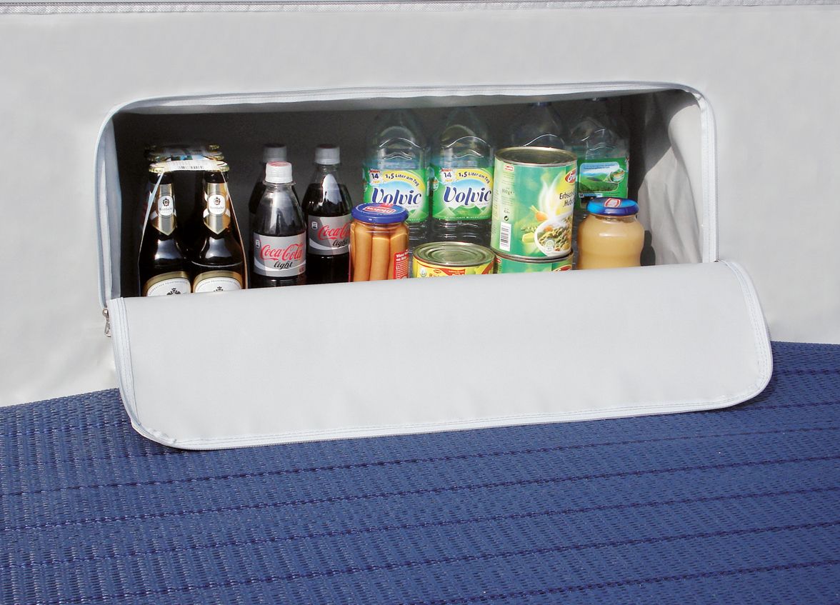 Die innovative, aus 50 cm hoher PVC-Plane hergestellte Bodenschürze nutzt mit ihrer fest und wasserdicht angeschweißten Aufbewahrungstasche den bislang ungenutzten Raum unterhalb des Wohnwagens und erschließt zusätzlichen Stauraum für z. B. Kinderspielzeug oder Schuhwerk; außerdem kann die Kühle unter dem Fahrzeug für die Aufbewahrung von Lebensmitteln oder Getränken genutzt werden. Ein Doppelreißverschluss verschließt die Tasche winddicht und ermöglicht gleichzeitig bequemen Zugang. Um Kondenswasserbildung zu vermeiden ist die Tasche mit einem Insektenschutzgewebe versehen, das für ständige Luftzirkulation sorgt. Dank des angeschweißten textilen Einzugskeders kann die Schürze problemlos von jedem Ende her passend gekürzt werden. Sie ist beliebig mit der Standard-Bodenschürze oder fahrzeugspezifischen Radkastenabdeckungen kombinierbar. Die Basis- und das Kurzelement verfügen über je 1 Tasche, die Fahrzeugschürzen sind mit 2 Taschen ausgestattet; Abmessungen Tasche ca. B 80 x H 35 x T 35 cm.