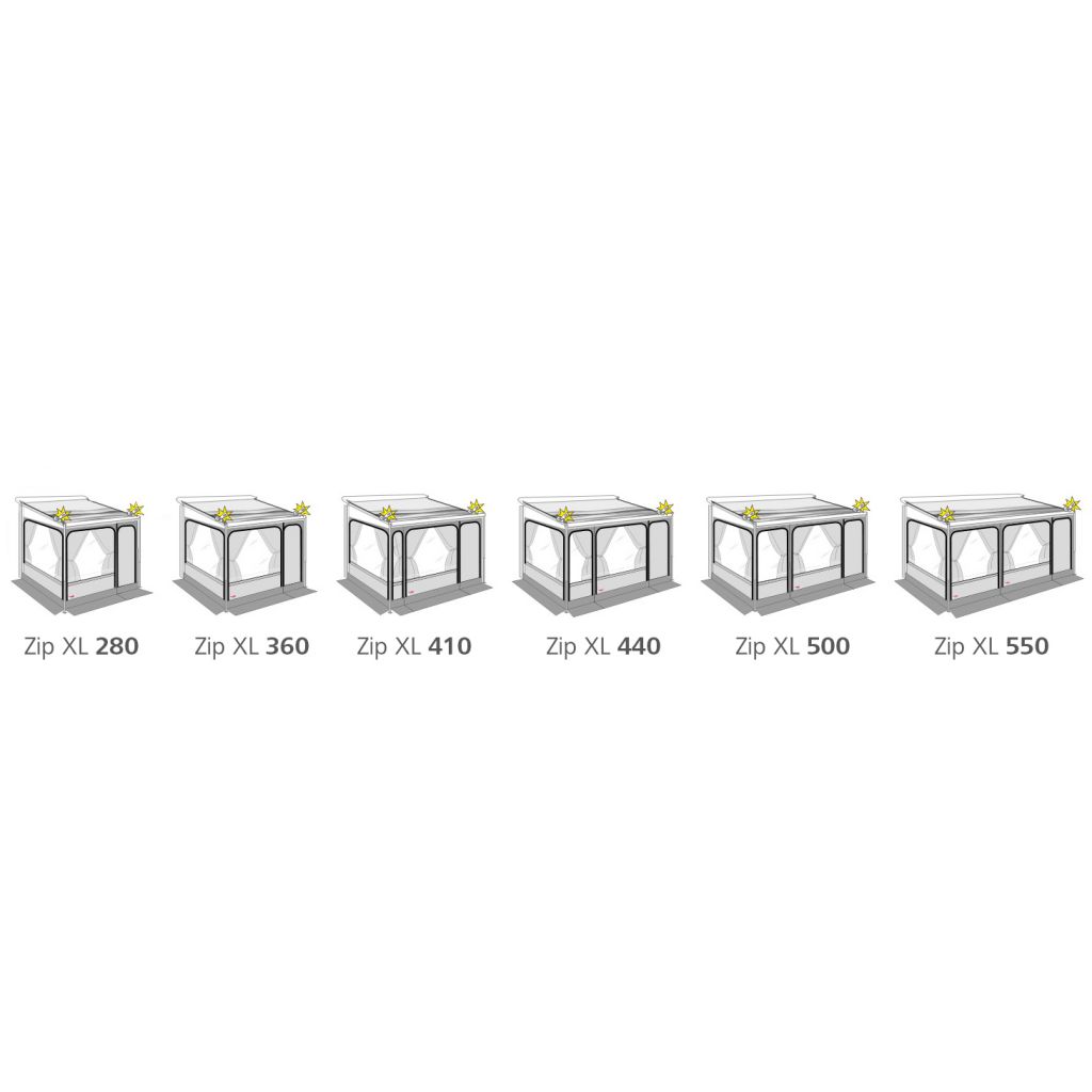 Gestänge: Rapid Set CS, Caravanstore, Support Leg (ab 3,60 m) und Rafter (ab 4,40 m). Kit Magic Privacy für eine zusätzliche Stabilität als Zubehör erhältlich.
