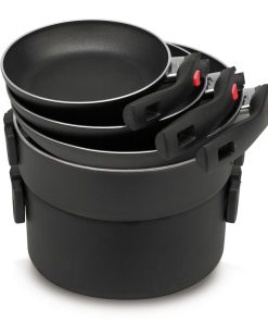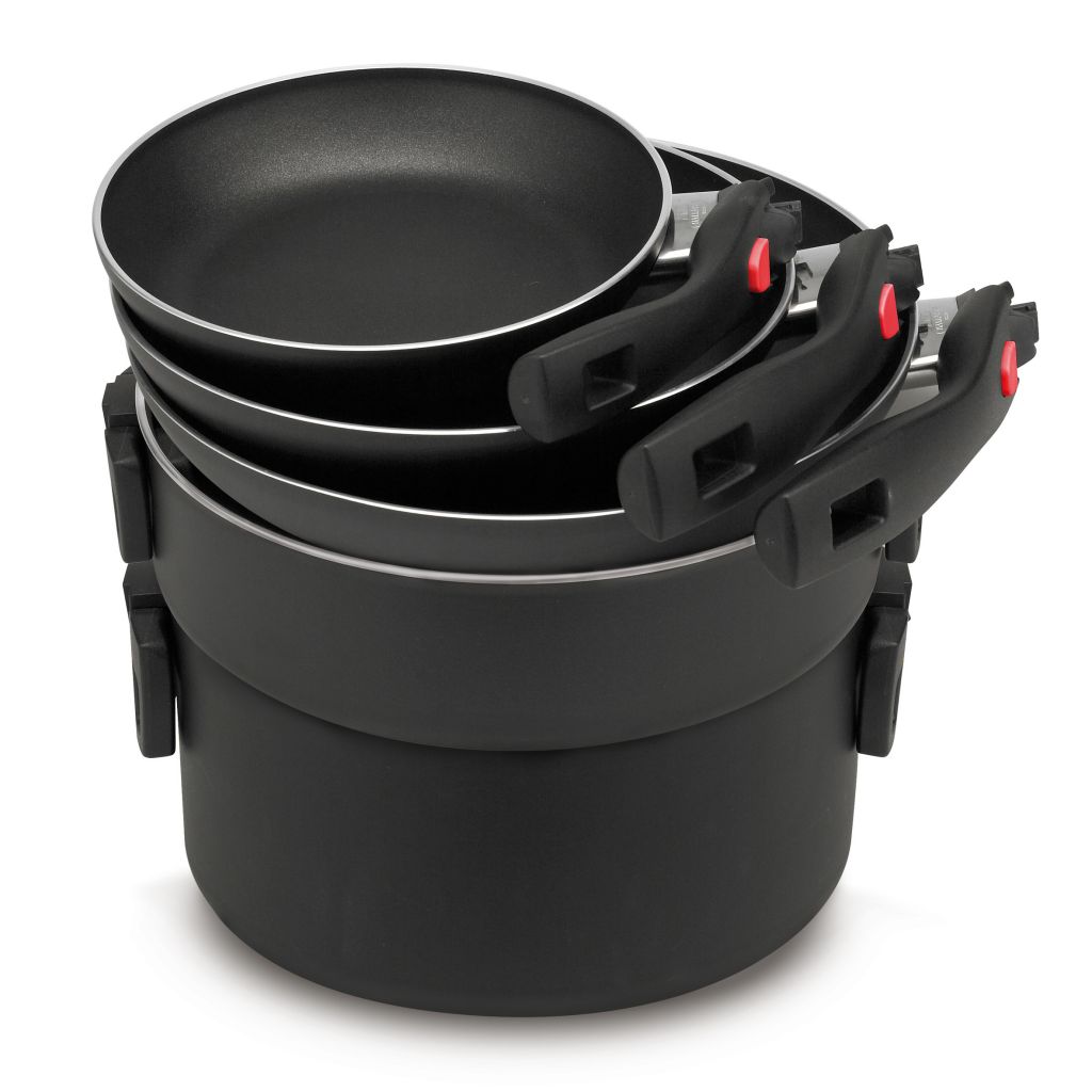Die Click&Cook Pfannenserie von Ballarini ist vielseitig einsetzbar und Platz sparend. Sie ist innen mit der 3-fach keramischen Antihaft-Versiegelung KERAVIS beschichtet und für alle Herdarten außer Induktion geeignet. Die Griffe können mit einer einfachen Bewegung eingeklappt und ausgeklappt werden. Die patentierte Arretierungsvorrichtung der Griffe erlaubt sicherste Handhabung während des Kochens.