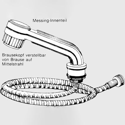 - Carlettamat Handdusche mit integriertem Messing-Ventil, dadurch ist eine Mengenregulierung sowie eine Umschaltung von Duschen auf Strahl möglich, sonst wie oben.
