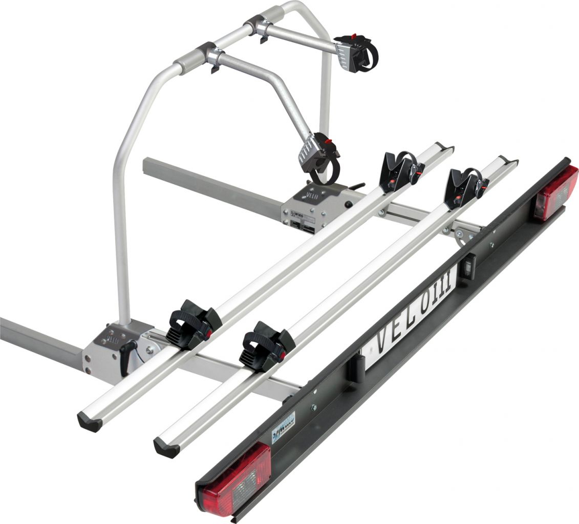 Für einen sicheren Transport von E-Bikes mit dem Wohnmobil eignen sich herkömmliche Trägersysteme weniger gut. Hoch an der Fahrzeugrückwand angebracht, kann das Beladen der bis zu 25 kg schweren E-Bikes Probleme bereiten. Der komplett aus Aluminium bestehende Träger Velo III wird direkt an den Rahmen des Reisemobils montiert, er ist stabil, hat eine niedrige Beladehöhe, ein geringes Eigengewicht und gestattet höhere Nutzlasten – abgestimmt auf E-Bikes. Fest angebrachte Schienen sorgen für guten Halt der Räder, ein Rüstsatz für E-Bikes wird mitgeliefert. Sollte der Träger einmal nicht benötigt werden, kann er platzsparend hochgeklappt werden. Nutzlast bis zu 80 kg, Gewicht ca. 16 kg.