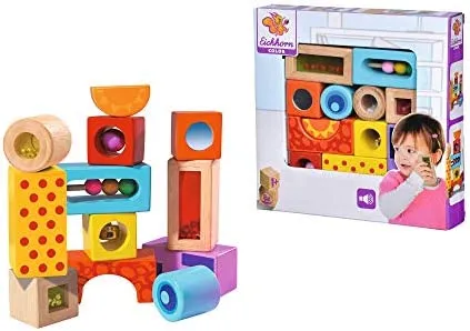 Produkt 1: 12 verschiedene Sound-Bausteine – Hier wird es nicht langweilig. Die Bausteine aus Holz machen unterschiedliche Rasselgeräusche mit Glöckchen, Kügelchen, Quietscher und mehr.