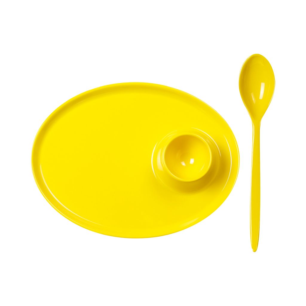 Eierbecher aus Melamin mit Löffel und praktischer Ablagefläche.