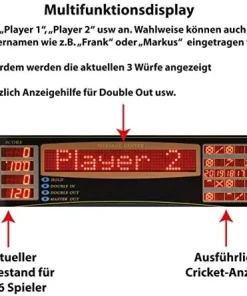 Das grosse Display in der Mitte zeigt Informationen für den aktuellen Spieler an, z.B. die letzten 3 geworfene Pfeile. Statt „Player 1“, „Player 2“ kann auch der Spielername wie z.B. „Frank“, „Markus“ einprogrammiert werden.