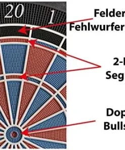 Wie bei den Turnierstandgeräten üblich, beträgt der Durchmesser der Scheibe 34cm und die Double und Triple Segmente besitzen ein 2-Loch System.