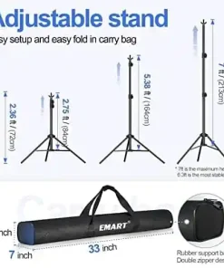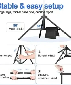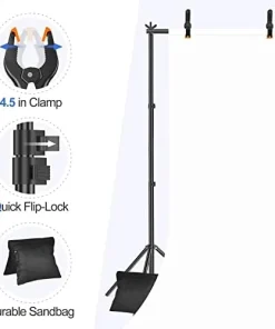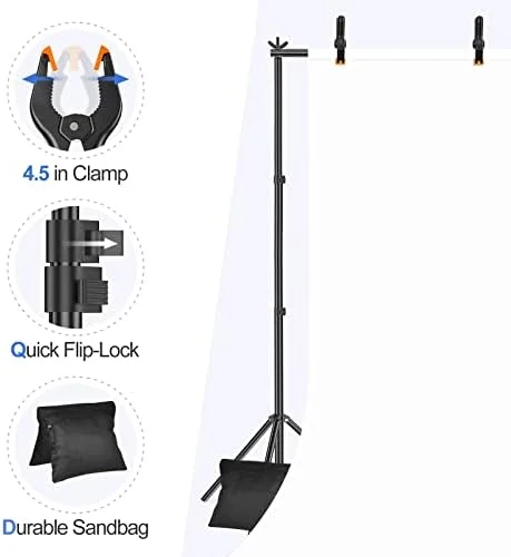 📦 Set beinhaltet:(2) Querstangen, (2) Robuste Lichtständer aus Aluminiumlegierung, (8) 11,4 cm Robuste Federklemmen, (2) Sandsäcke, (1) Tragbare Tragetasche