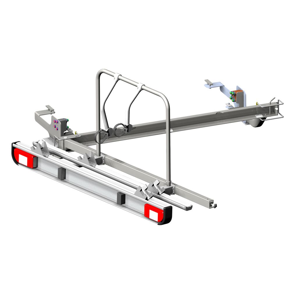 Der speziell für den Transport von E-Bikes entwickelte Träger kann auch im beladenen Zustand vom Fahrzeug weggeklappt werden und erlaubt so den freien Zugang zu beiden Hecktüren. Bei Nichtbenutzung kann der Ausleger des Trägers platzsparend nach oben geklappt werden. Der Träger wird mittels Adapter direkt mit dem Fahrzeugchassis verschraubt. Montage sollte stets durch einen autorisierten Fachhändler durchgeführt werden (Achtung: nicht für Fahrzeuglänge 6,2 und 6,4 m kompatibel!).