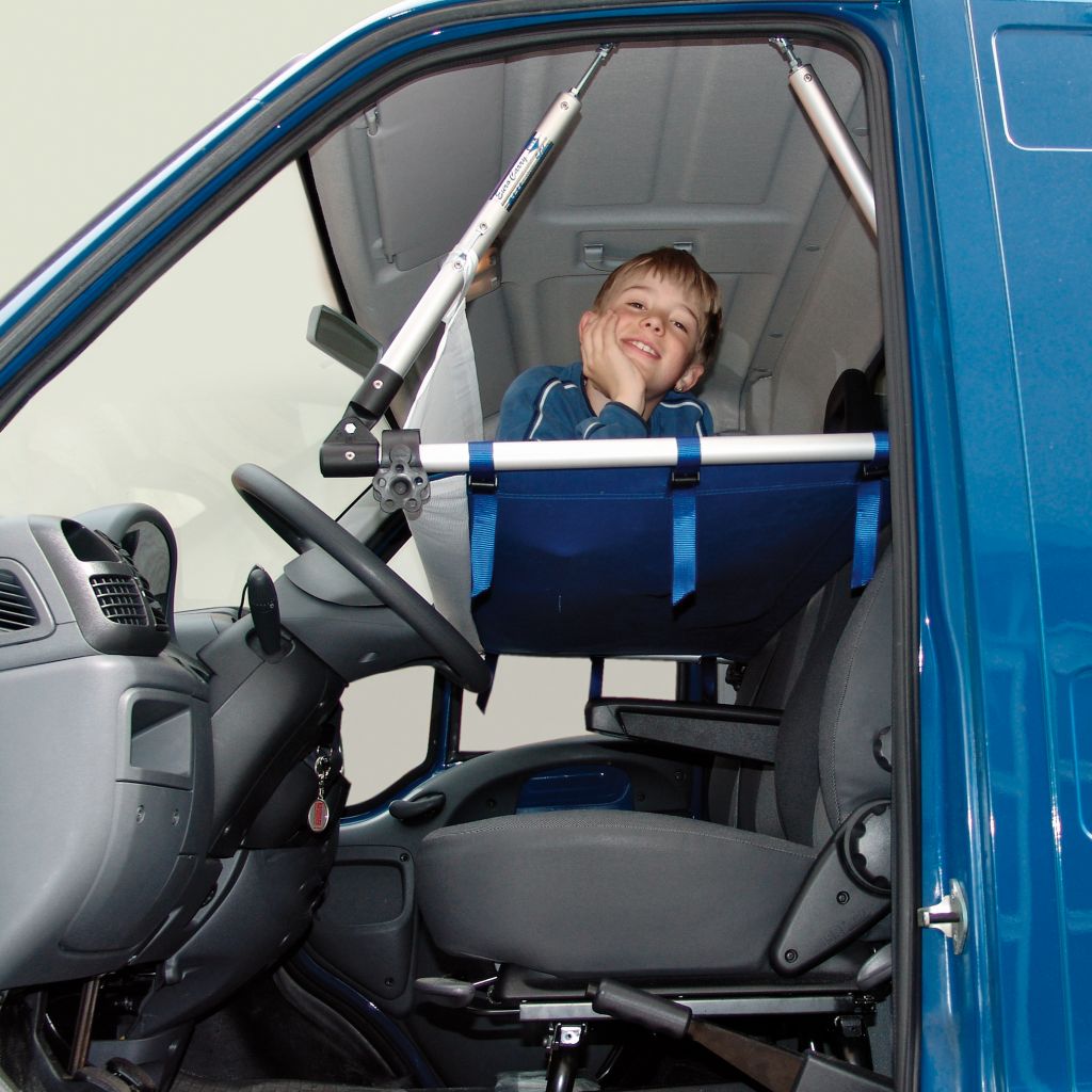 Das bequeme EuroCarry Kinderbett ist innerhalb von wenigen Minuten zusammengebaut und wird einfach an den Innenraum Haltegriffen in die Fahrerkabine gehängt.