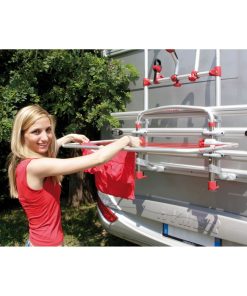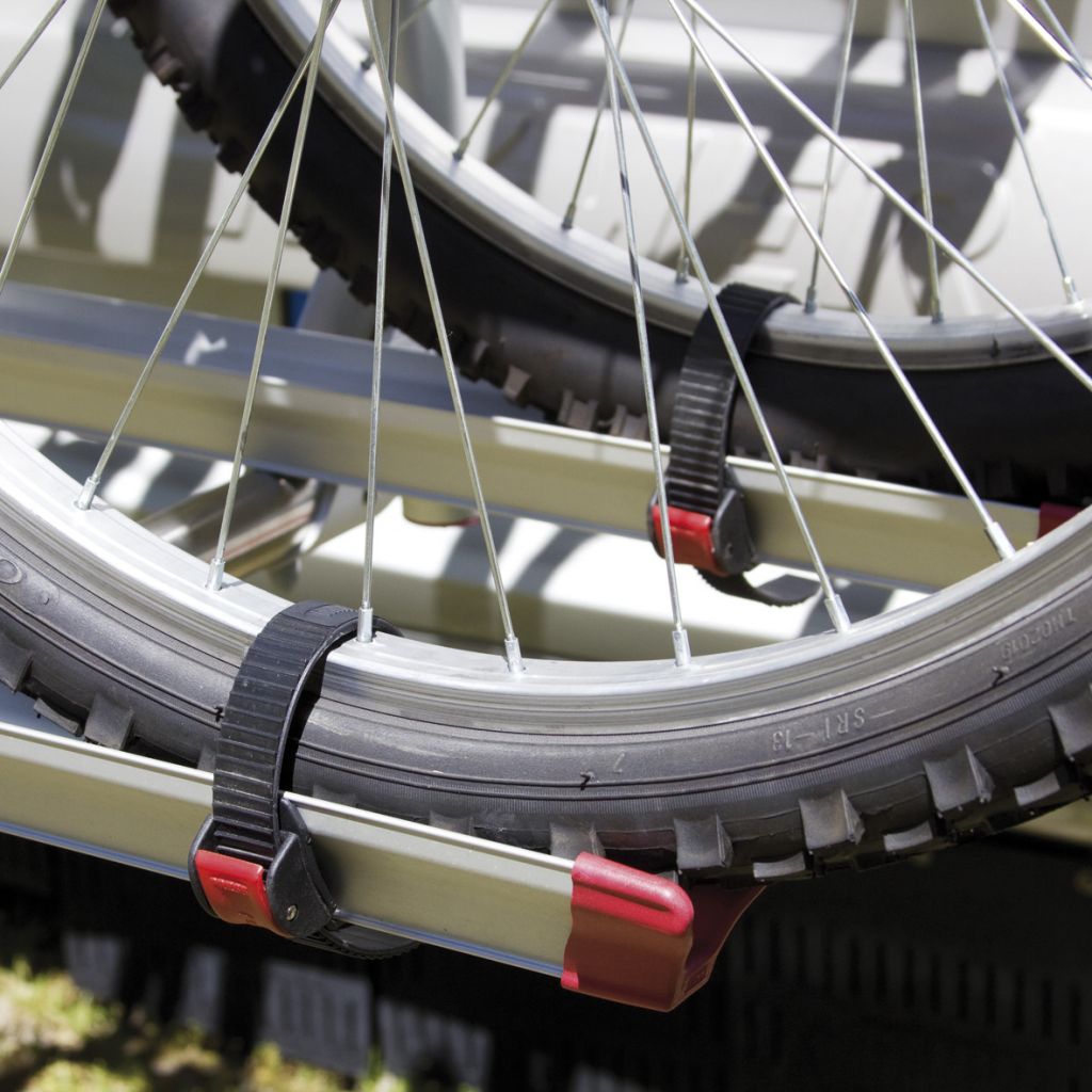 Rail Premium S – Elegante Schiene, welche im Vergleich zu den herkömmlichen Schienen weniger Platz einnimmt, da sie sich seitlich und in der Tiefe verschieben lässt. Verstärkte Struktur. Komplett mit Feststellklötzen und angebrachten Quick-Riemen, um die Räder einfach und schnell zu sichern. Das Anbringen der Schienen am Auflagebügel des Fahrradträgers erfolgt durch solide Bügel, das Bohren ist hier nicht erforderlich.