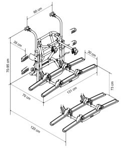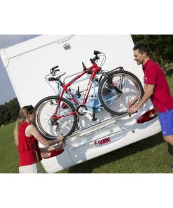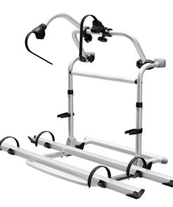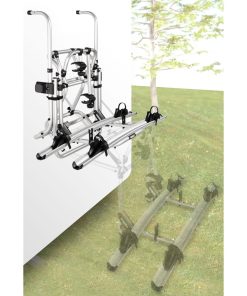 Fahrradträger für 2 Fahrräder oder E-Bikes mit Tragfähigkeit 50 kg (maximal 30 kg je Schiene), überbrückt eine Höhendistanz von 70 cm. Erhältlich in 2 Ausführungen: mit 12-Volt-Motor oder mit Handkurbel. In der niedrigsten Position kann man die Fahrräder problemlos zwischen den Radschuhen mit Felgenhaltebändern (Ratschenfunktion) auf den gebogenen Schienen und mit den abschließbaren Abstandshaltern fixieren. Auf Knopfdruck oder per Kurbelbetrieb fährt man dann den Träger in die Transportstellung; erweiterbar auf 3 Fahrräder.