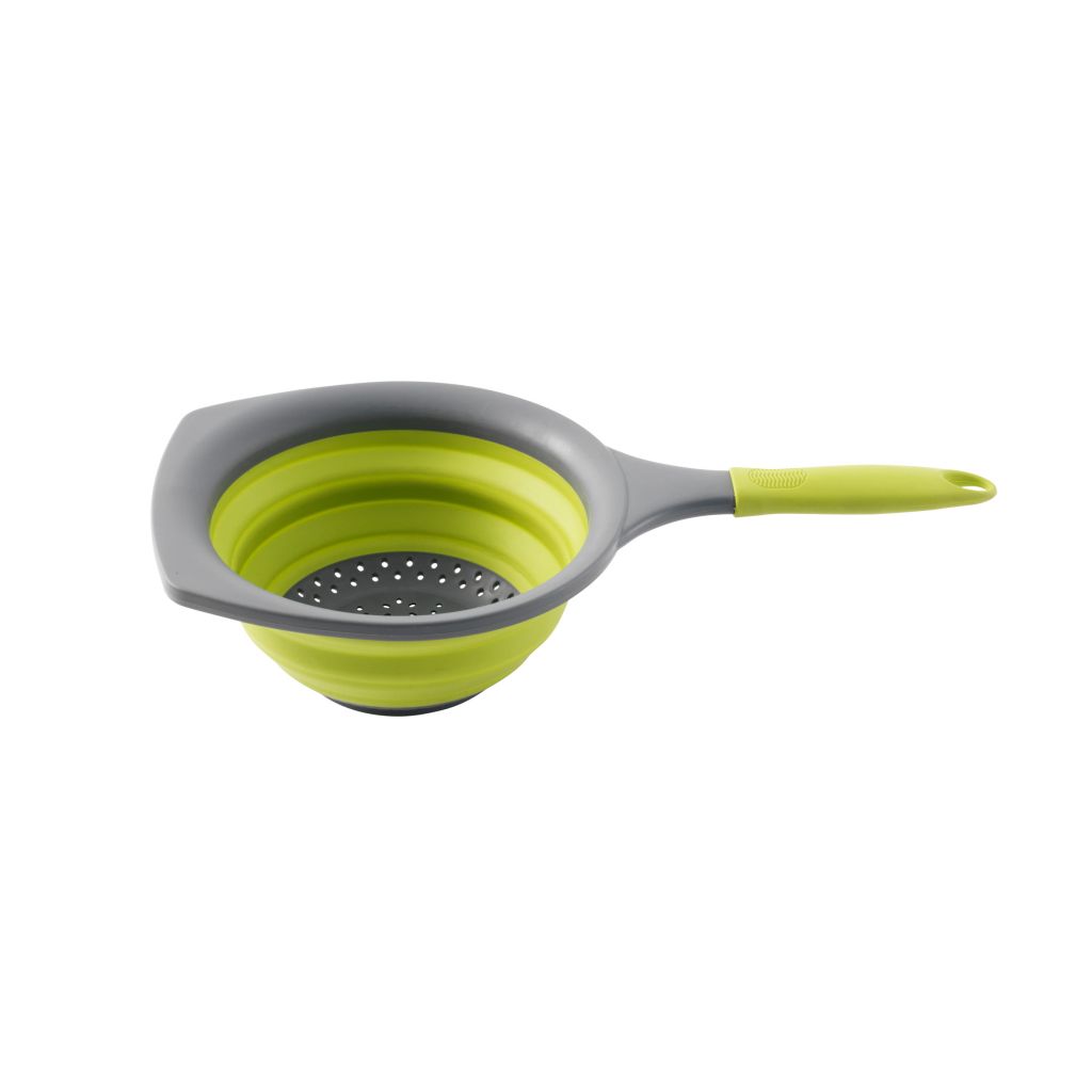 Faltbares Sieb mit Handgriff, kleines Packmaß, stabile Ausführung. Material: Silikon und Plastik.