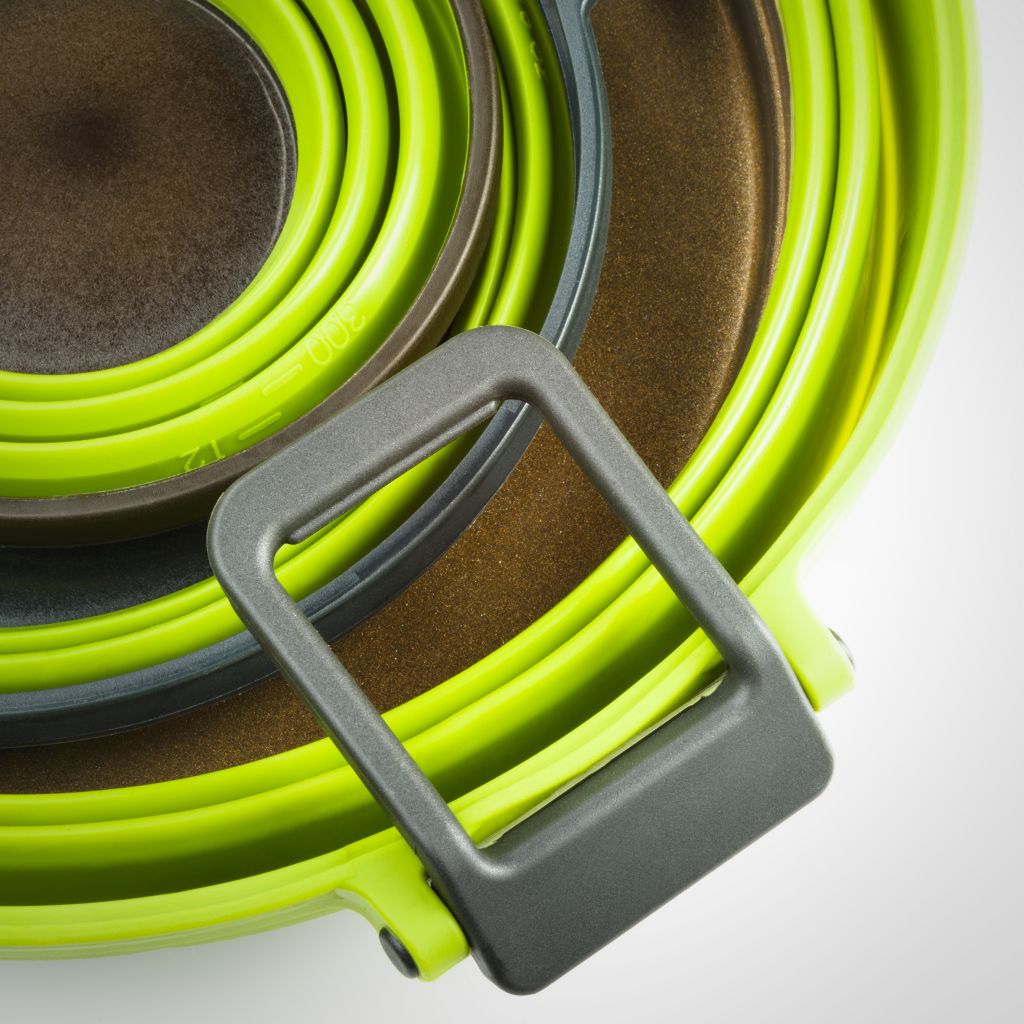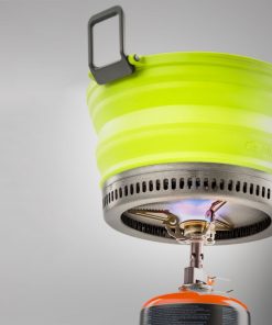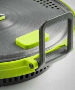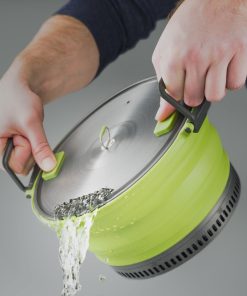 Faltbarer Kochtopf mit integriertem Wärmetauscher. Reduziert den Brennstoffverbrauch um bis zu 30 % (mit vergleichbaren Falttöpfen). Bratpfanne mit Nonstick-Teflonbeschichtung. Extrem kleines Packmaß.