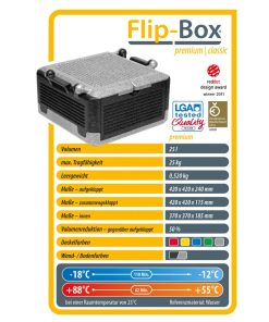 Diese Isolierboxen sind die hochwertigsten im Flip-Box®-Sortiment. Mit über 25 und 39 Litern verfügen sie über besonders viel Transportvolumen. Aufgrund ihrer extra stabilen Wände (25 mm) und Gelenke können sie bis zu 25 kg Gewicht tragen. Die perfekte Isolierung hält gekühlte Getränke über 10 Stunden lang kühl. Die Verrastungen der Seitenwände und Deckel machen sie besonders dicht und stabil. Damit sind die Flip-Box® Premium und Flip Box® Big die idealen Transportboxen auch bei hoher Beanspruchung. Stabil und stapelbar.