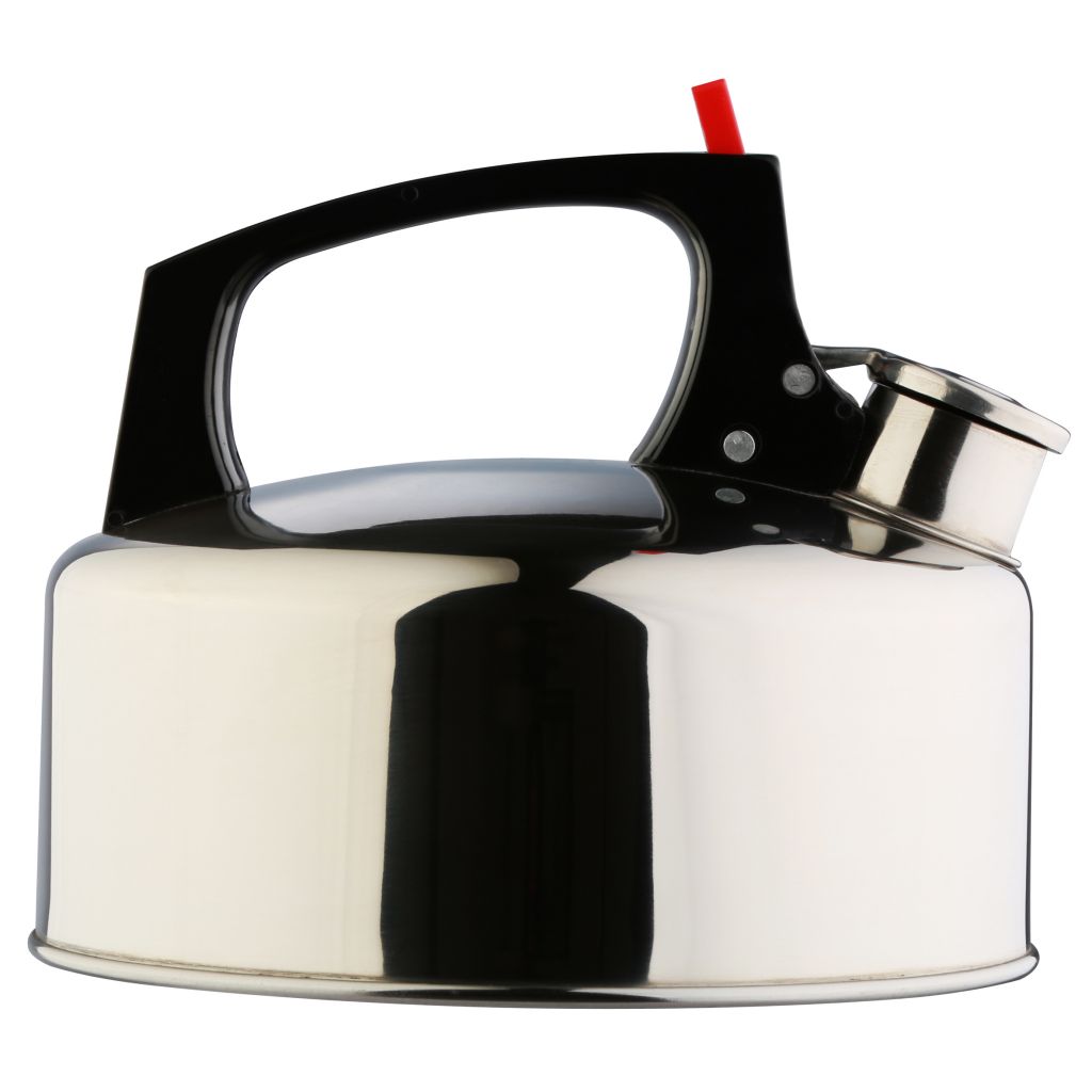 Aus Edelstahl, mit Kunststoffgriff und Pfeifvorrichtung.