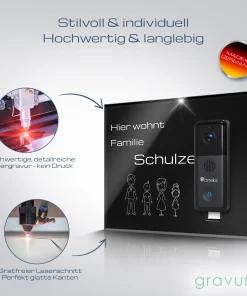 Die Funkklingelschilder aus Edelstahl & Acrylglas werden in unserer hauseigenen Produktionsstätte nach Industriestandard lasergeschnitten und graviert. Die Klingelplatte besticht nicht nur mit ihrer Optik, sondern auch mit ihrer Witterungsbeständigkeit – sie ist beständig, rostet nicht und trotzt Wind und Wetter.