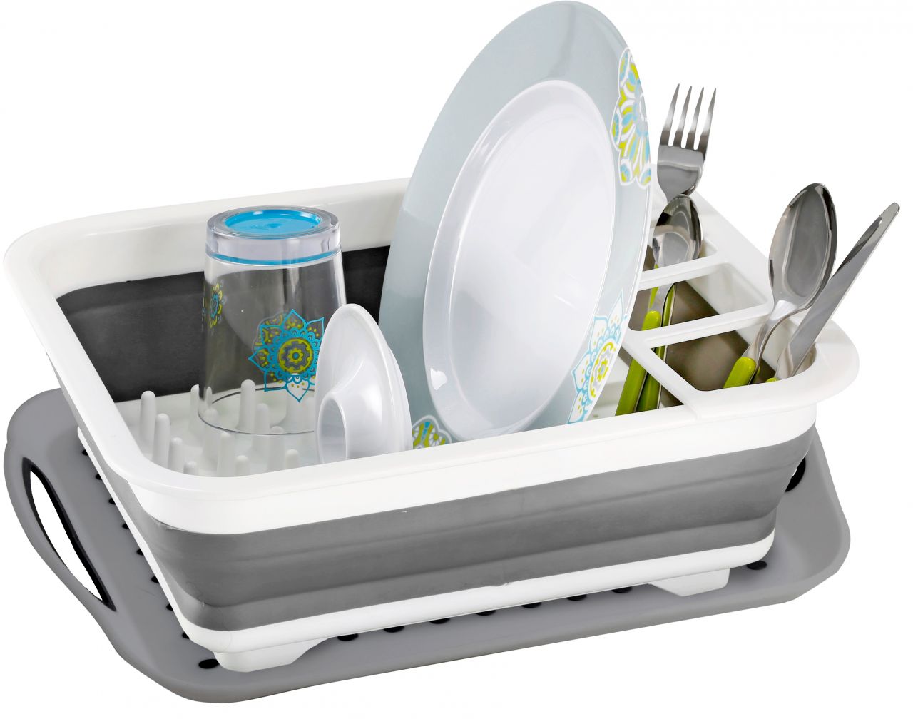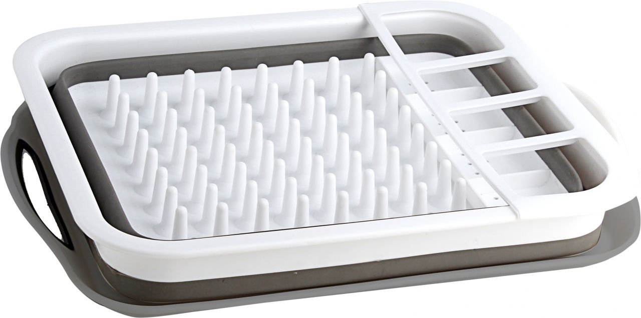 Faltbarer Geschirrabtropfer mit Besteckhalterung. Aus Kunststoff.