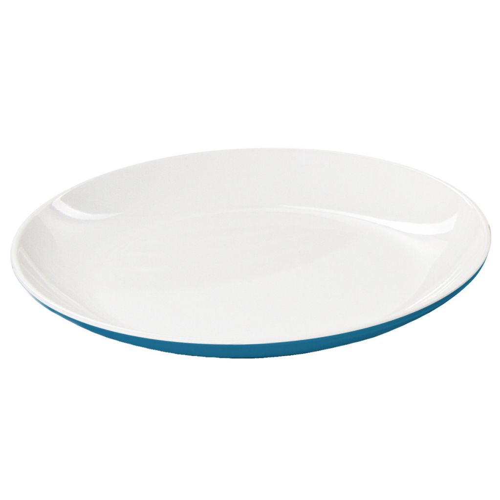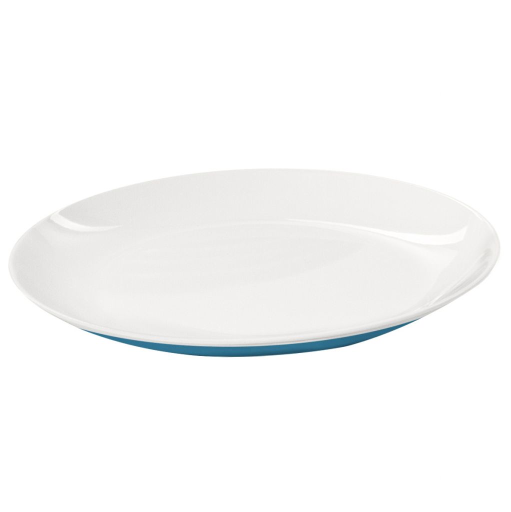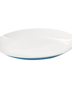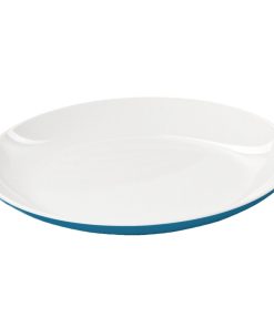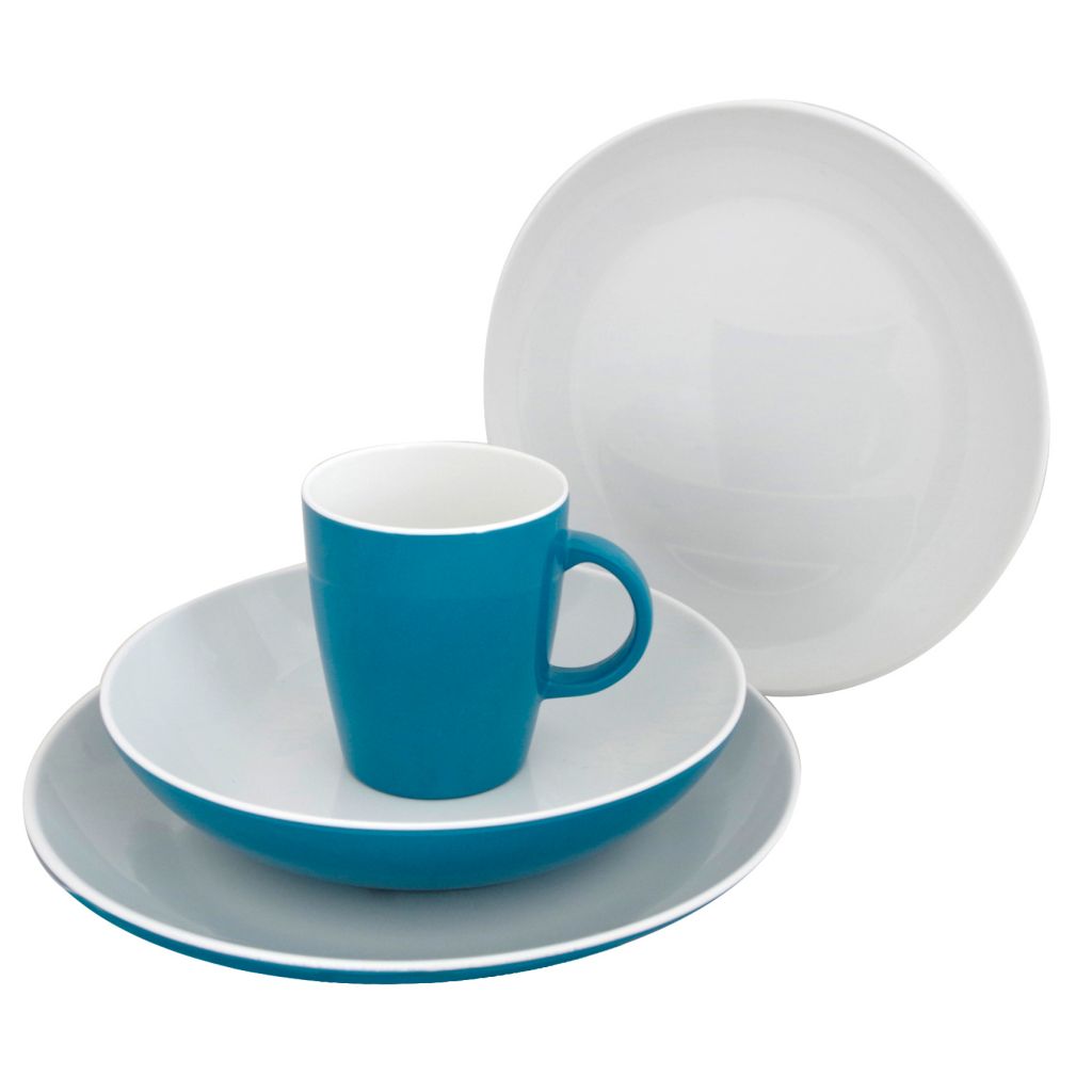 Geschirrset in hellblau/weiß mit cleveren Details. Im Boden ist eine Spülwasser-Ablaufaussparung. Außerdem ist das Geschirr mit Gummifüßen gegen Wegrutschen ausgestattet.