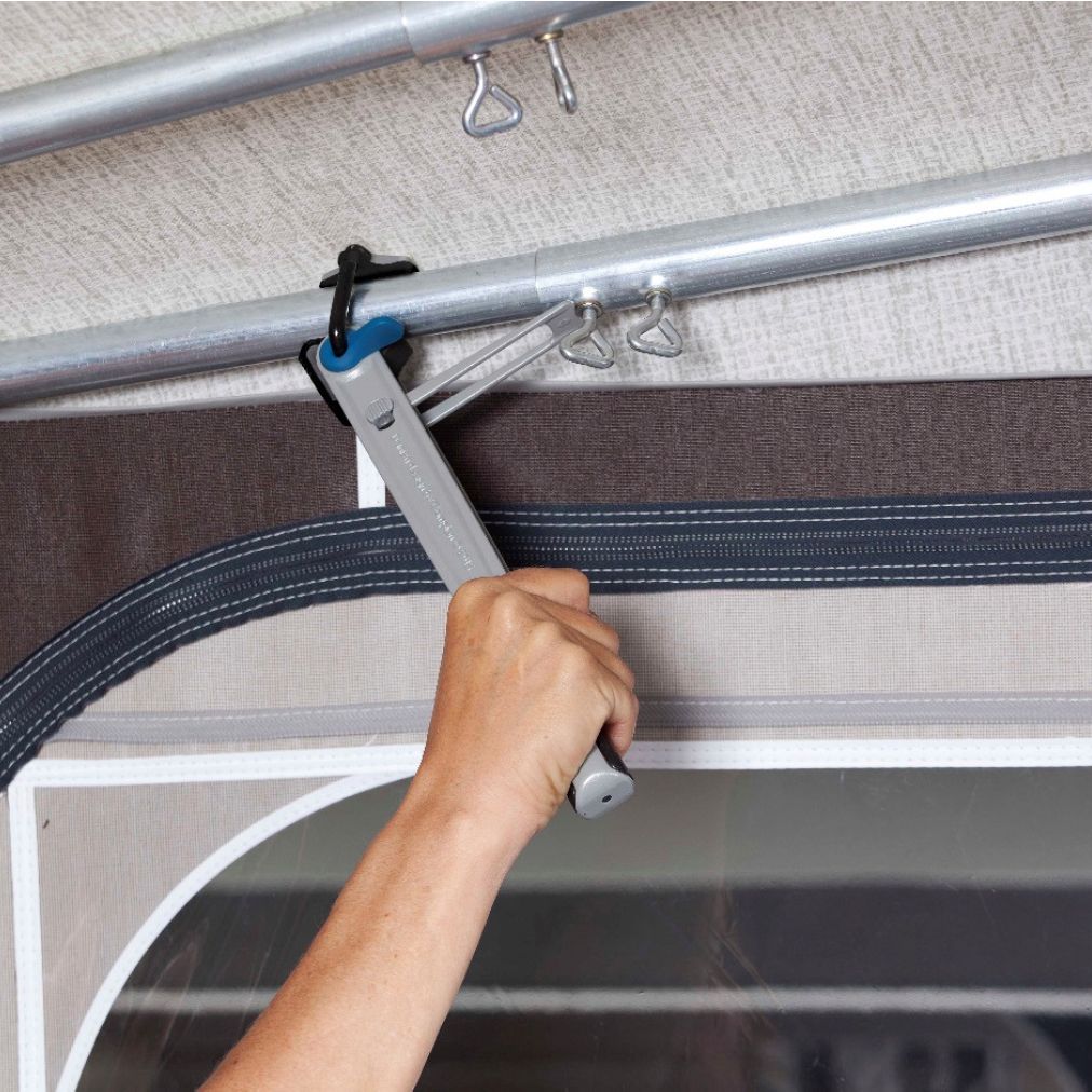 Die 3. Generation vom Hercules – einem einzigartigen Werkzeug zum Abspannen Ihres Vorzelts und damit einer korrekt gespannten Zeltplane. Auf diese Weise werden Windgeräusche vermieden und eine wesentlich höhere Stabilität erreicht. Außerdem trägt es durch eine gleichmäßige Belastung aller Teile zu einer längeren Lebensdauer Ihres Vorzelts bei. Der Hercules Triple ist in mehreren Punkten verbessert. Für die Klemmbacken wurde ein neues und verbessertes Material gewählt, das für stärkeren Halt am Gestänge sorgt. Durch eine einfache Drehung kann der Hercules auf alle Gestängestärken zwischen 22 und 32 mm eingestellt werden. Hinzu kommt ein integriertes Spannsystem, durch das sichergestellt ist, dass das Werkzeug sofort fasst.