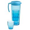 Innovatives Trinkglas mit integriertem Magnet. Farblich sortiert (rot, blau, grün, gelb, brombeer, grau). Set enthält 6 Gläser + 6 Untersetzer.