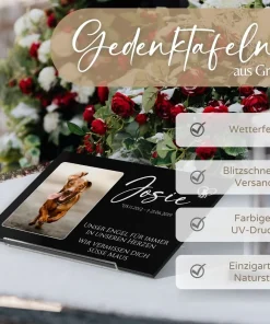 Das gesonderte Lasergravurverfahren sorgt dafür, dass die obere Schicht abgetragen wird und ein schöner Kontrast zum dunklen Narturschiefer entsteht. Im Anschluss wird Deine andachtsvolle Gedenkplatte aufwendig versiegelt. Dadurch kann sie mit einer überdurchschnittlichen Haltbarkeit im Außenbereich und absoluter Witterungsbeständigkeit punkten.