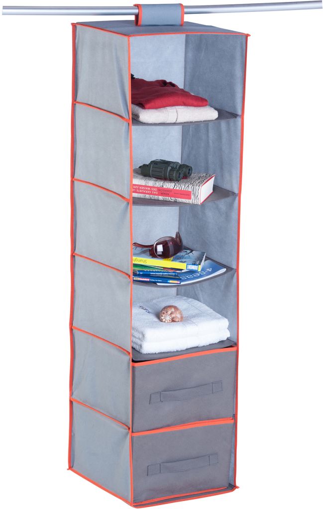 Mit 4 offenen Fächern für Hemden, Handtücher, etc. sowie 2 Schubladen für Unterwäsche und Socken; Maße B 33 × T 33 × H 120 cm.