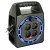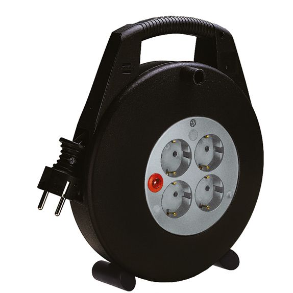 Standfeste Kabeltrommel mit stabilen Doppelfuß. Schlagfestes Gehäuse. Bestückt mit 4 Schuko-Steckdosen und Überhitzungsschutz. Kabel H05VV-F 3G1,5 mm². Nur für den Innenbereich. Nicht feuchtraumgeeignet!