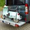 Für Erkundungstouren beim Campen werden Motorroller immer beliebter, denn für sie ist keine extra Führerscheinklasse notwendig – und Transportmöglichkeiten für Motorroller gibt es, wenn es die Zuladung zulässt, passend für fast jedes Reisemobil. Grundsätzlich kann ein Motorroller in einer geräumigen Heckgarage oder am Heck des Reisemobils auf einem Lastenträger transportiert werden. Da in beiden Fällen Einschränkungen hinsichtlich der verbleibenden Zuladung des Reisemobils zu beachten sind, bestehen die Linnepe-Trägersysteme aus salzwasserbeständigem Aluminium. Dabei bieten sie mindestens die gleiche Stabilität wie herkömmliche Stahlträger verbunden mit einem erheblichen Gewichtsvorteil. Alle außen montierten Trägersysteme werden mit dem Chassis verbunden und nicht mit dem Aufbau. Sie sind abnehmbar und werden mit einem EG-Typengutachten geliefert, somit ist kein Eintrag in die Fahrzeugpapiere notwendig. Aufpreis für eine zusätzlich erforderliche Rahmenverlängerung für Fahrzeuge ohne oder mit nicht tragfähiger Rahmenverlängerung € 369,–.