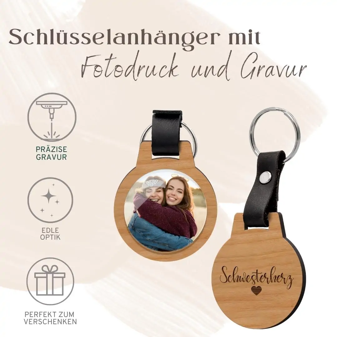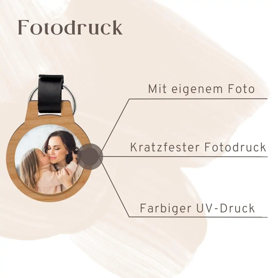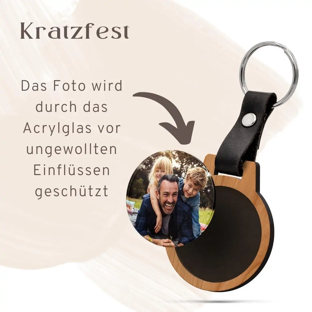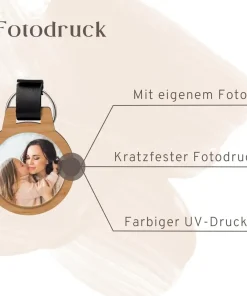 Gestalte einen individuellen Schlüsselanhänger mit Foto und Gravur aus echtem Holz – egal, ob für Dich oder Deinen Lieblingsmenschen. Jeder von uns hat Menschen in seinem Leben, welche einem die Welt bedeuten. Wir sind unendlich dankbar für die gemeinsamen Momente und Augenblicke, die wir mit dieser Person sammeln durften. Trotzdem fällt es uns manchmal schwer die Zuneigung und Wertschätzung, die wir diesem Lieblingsmenschen entgegenbringen, in Wort zu fassen. Unsere individuell gravierten Schlüsselanhänger aus Echtholz mit einem persönlichen Foto-Druck geben Dir eine wundervolle Möglichkeit, unvergleichliche Freude zu verschenken. Egal, ob für Deinen Partner, den besten Freund oder ein unersetzliches Familienmitglied – dieser personalisierte Eyecatcher schmückt jeden Schlüsselbund und begleitet Deinen Lieblingsmenschen bei jedem Schritt.